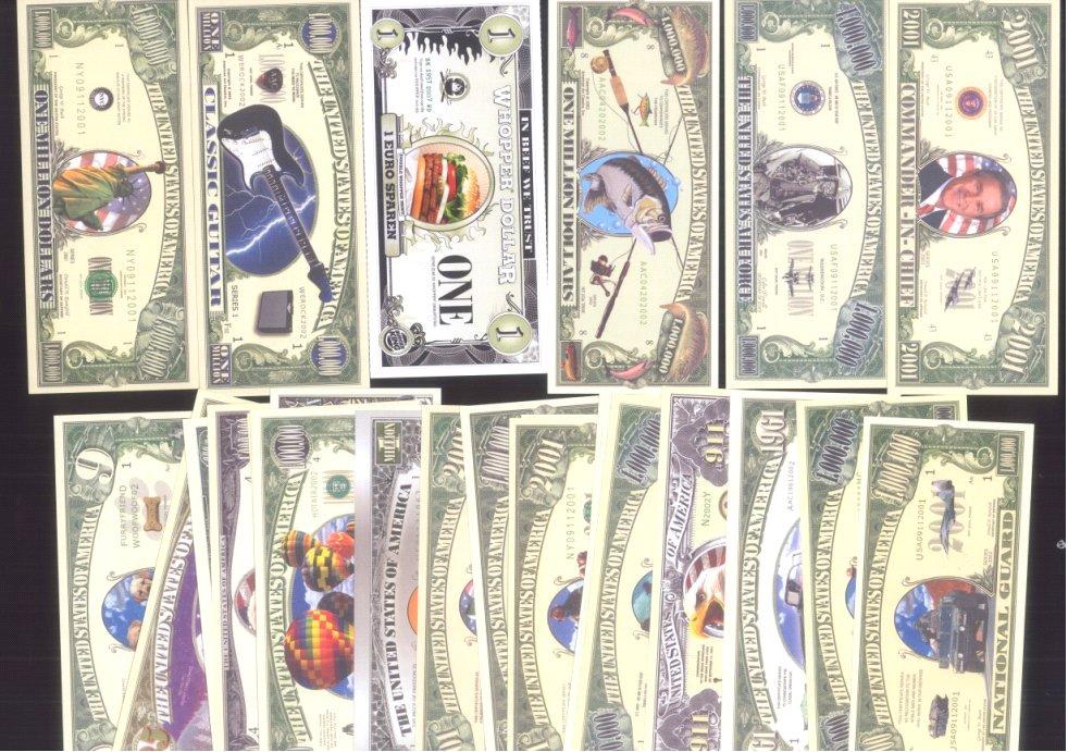 gesamt 55 Stück davon an die 26 Scheine aus Aller Welt (dabei CHINA und SOWJETUNION) in gebrauchter Erhaltung und an die 29 „FANTASIEBANKNOTEN USA“ von 1 Dollar bis zu 1 Millionen Dollar – natürlich in „kassenfrisch“, alles abgebildet im Internet.