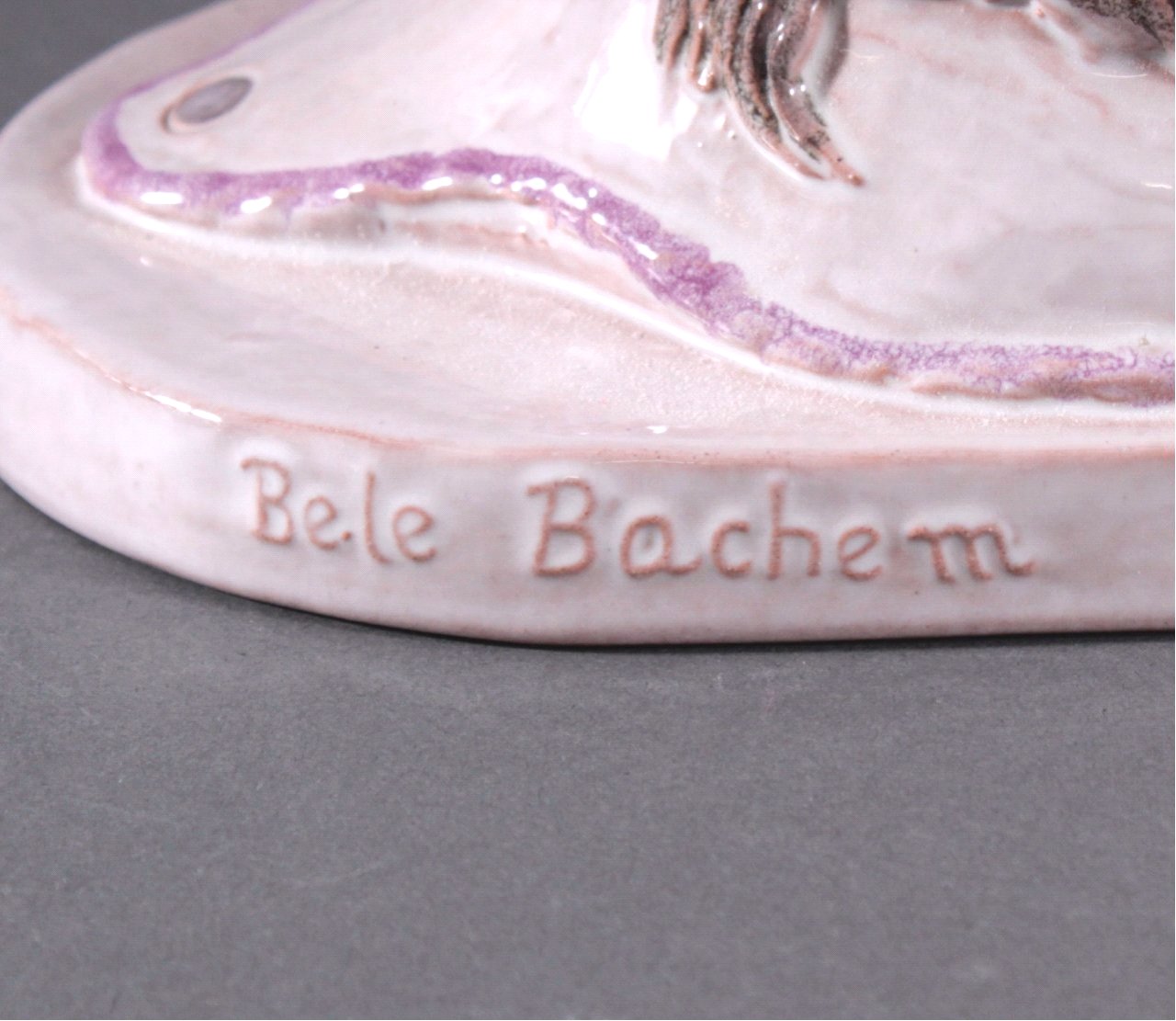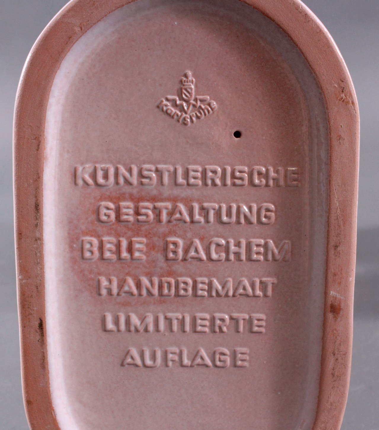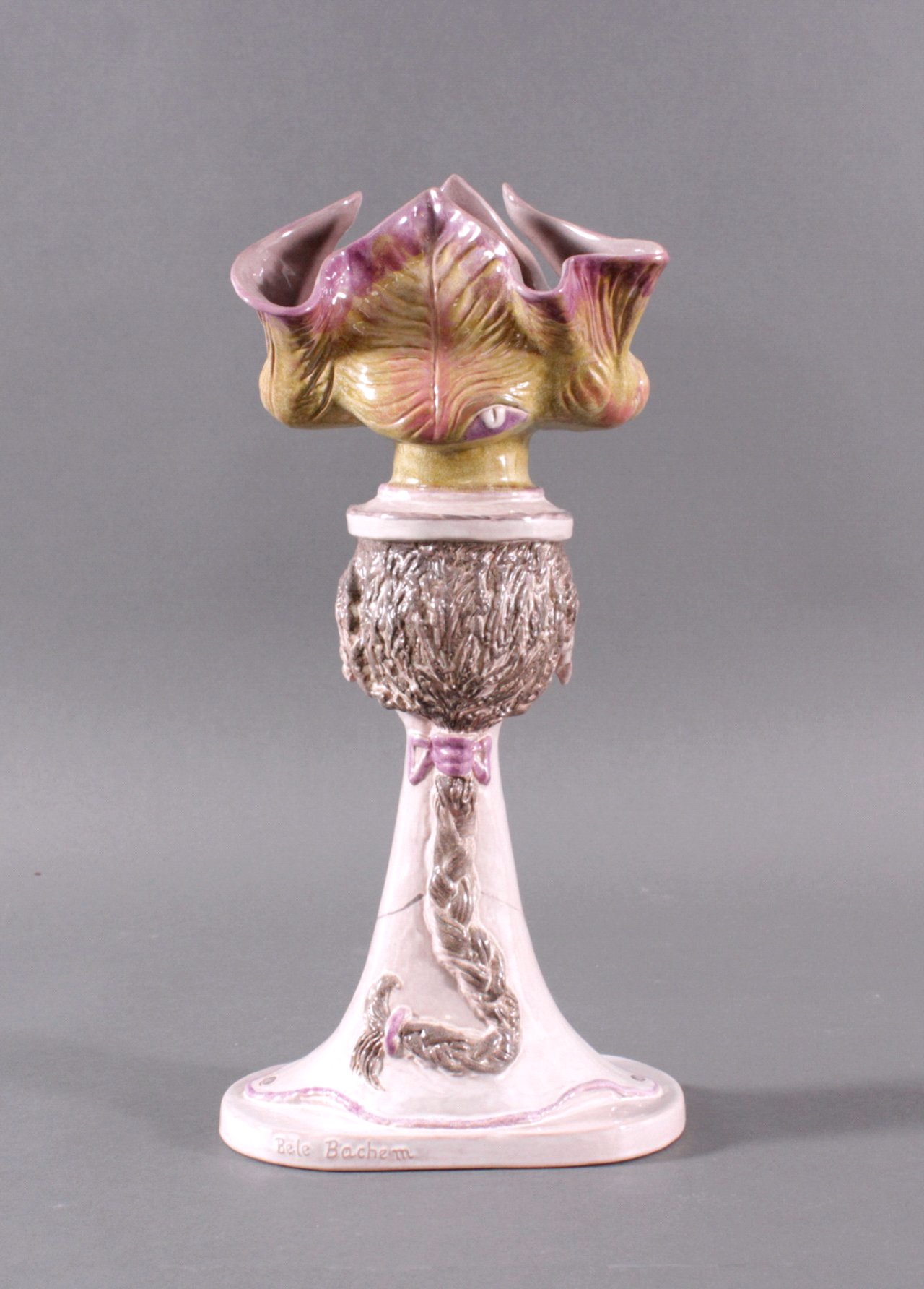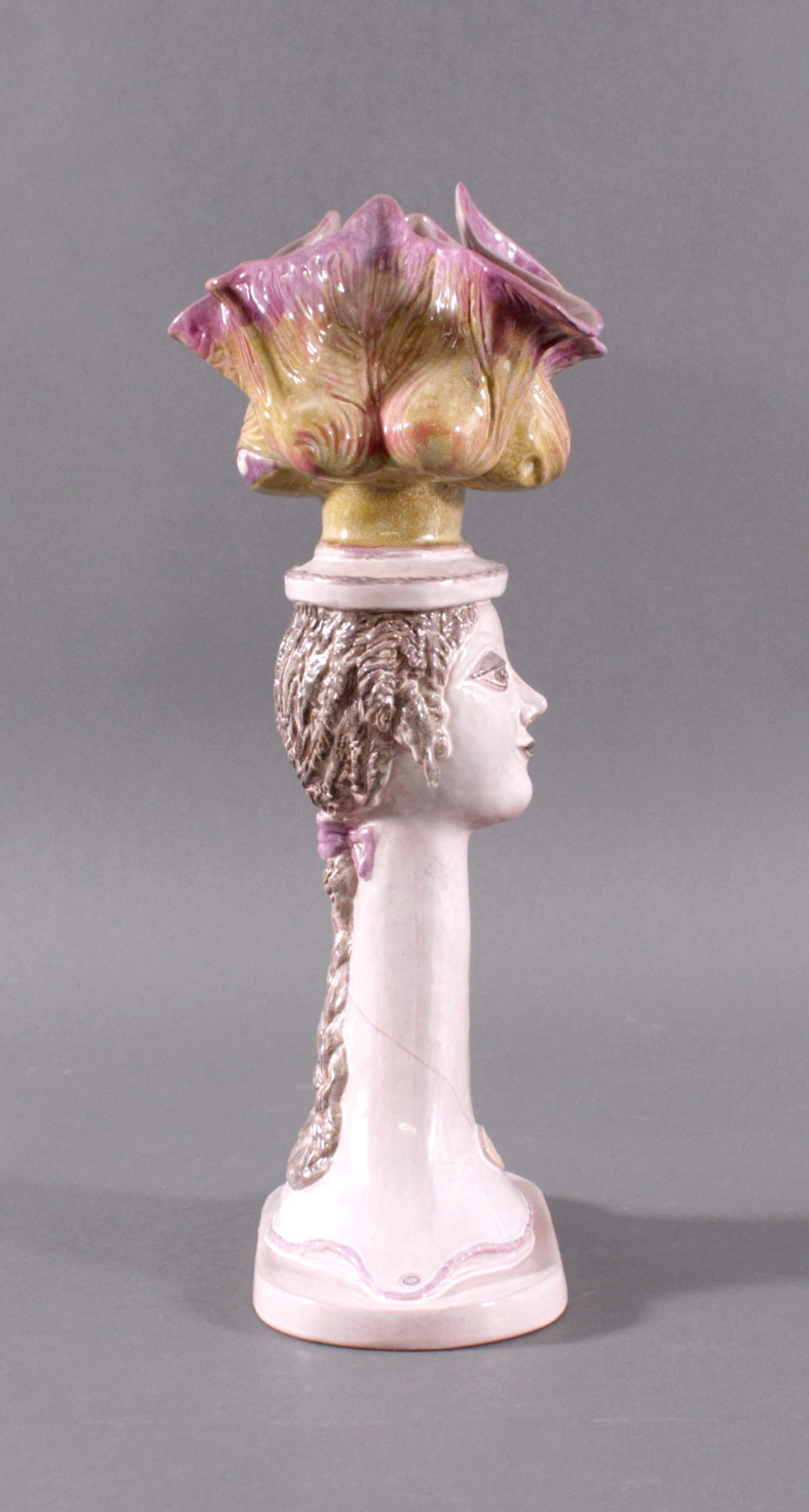 Entwurf Bele Bachem (Düsseldorf 1916 – 2005 München), Weibliche Büste mit Kohlkopf, Motiv aus dem antiken Mythos von Apollo und Daphne, auf 2500 Stück limitierte Auflage, die Vase hat die Nummer 858. Mit Zertifikat. Ziegelroter Scherben, weiß und violett glasiert, der Salat am Ansatz grün über violett, auf Plinthenrand Name der Künstlerin, Boden mit Herstellermarke, ca. H- 45 cm