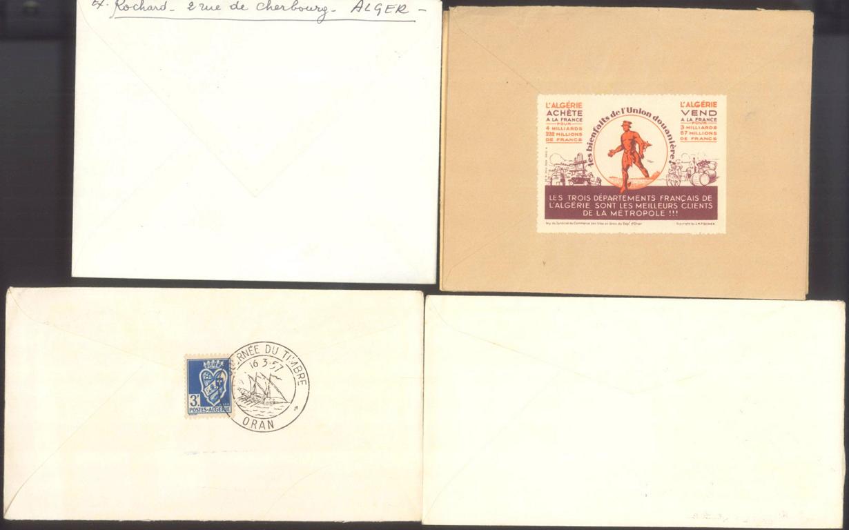 5 Bedarfsbelege aus ORAN, MOSTAGANEM und ALGER, alle gelaufen an den POLIZEI INSPEKTOR Paul Martin Barth in HAMMAM BOU HADJAR (Department ORAN). Dabei die Michelnummern 125, 330 (NICHT VERAUSGABT!), 354 (FDC mit rückseitiger Vignette!), 360, 363 (NICHT VERAUSGABT!) und 367 (NICHT VERAUSGABT!). In ORAN wurden während des ALGERIENKRIEGES 1954-1962 viele Menschenrechtsverletzungen durch den Französischen Staat verübt.