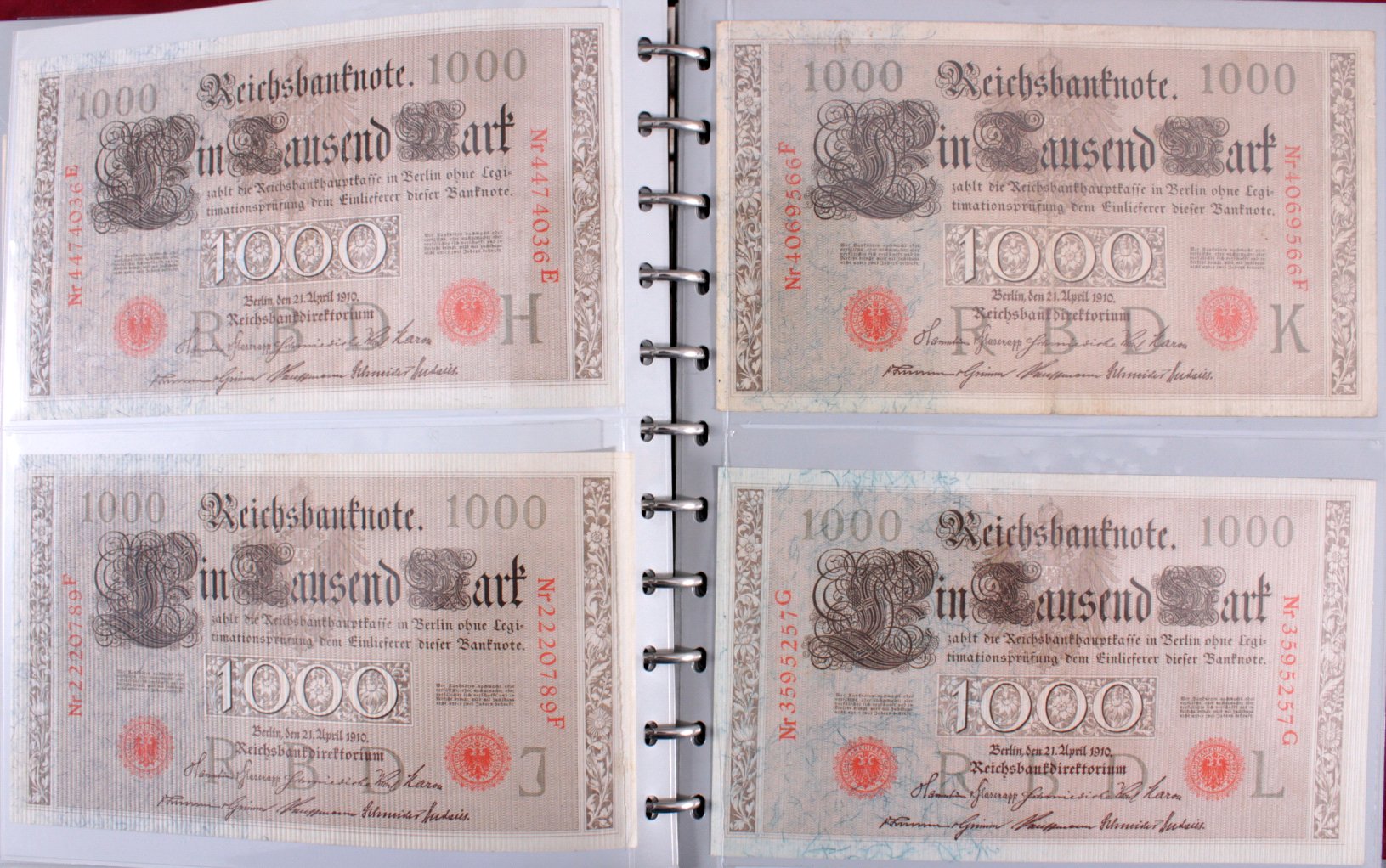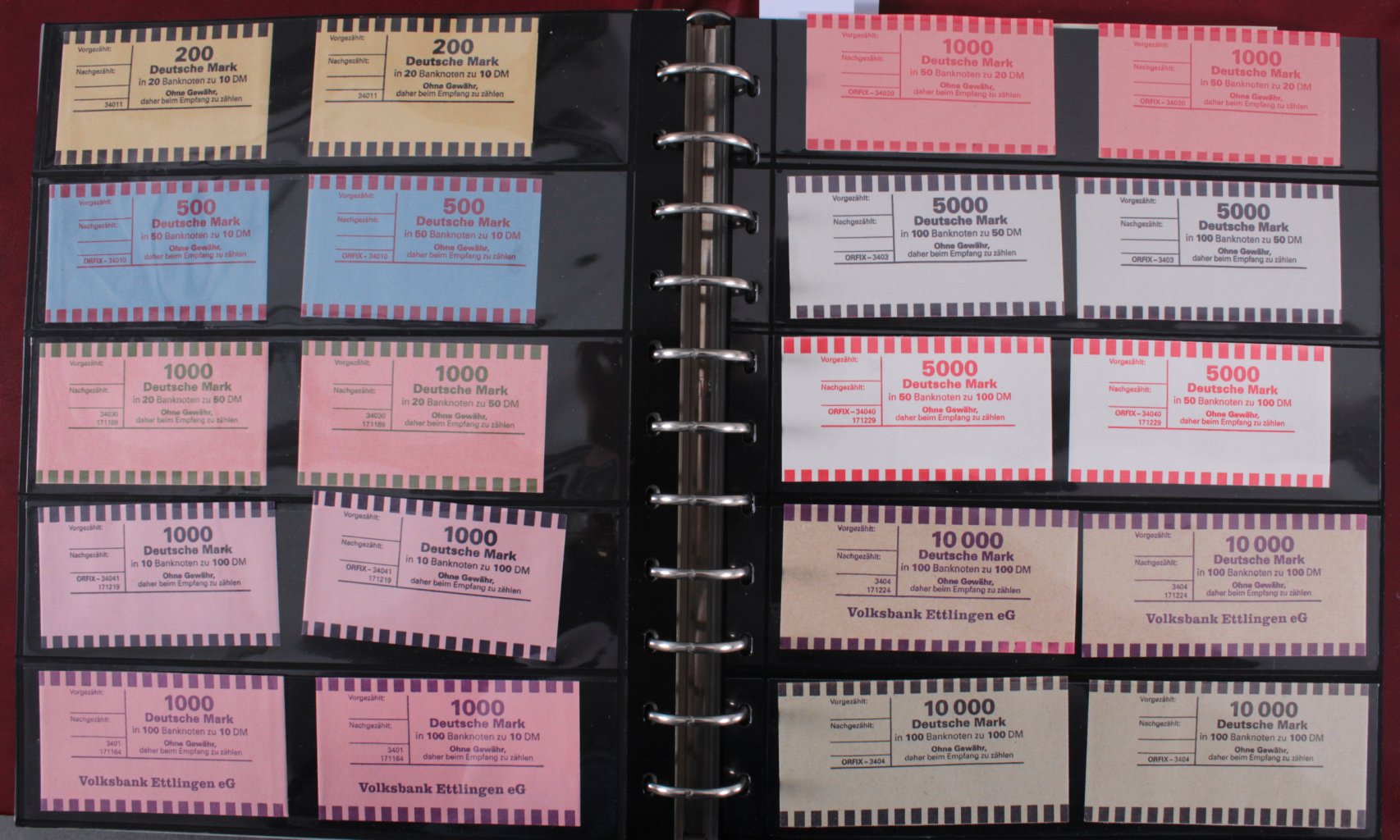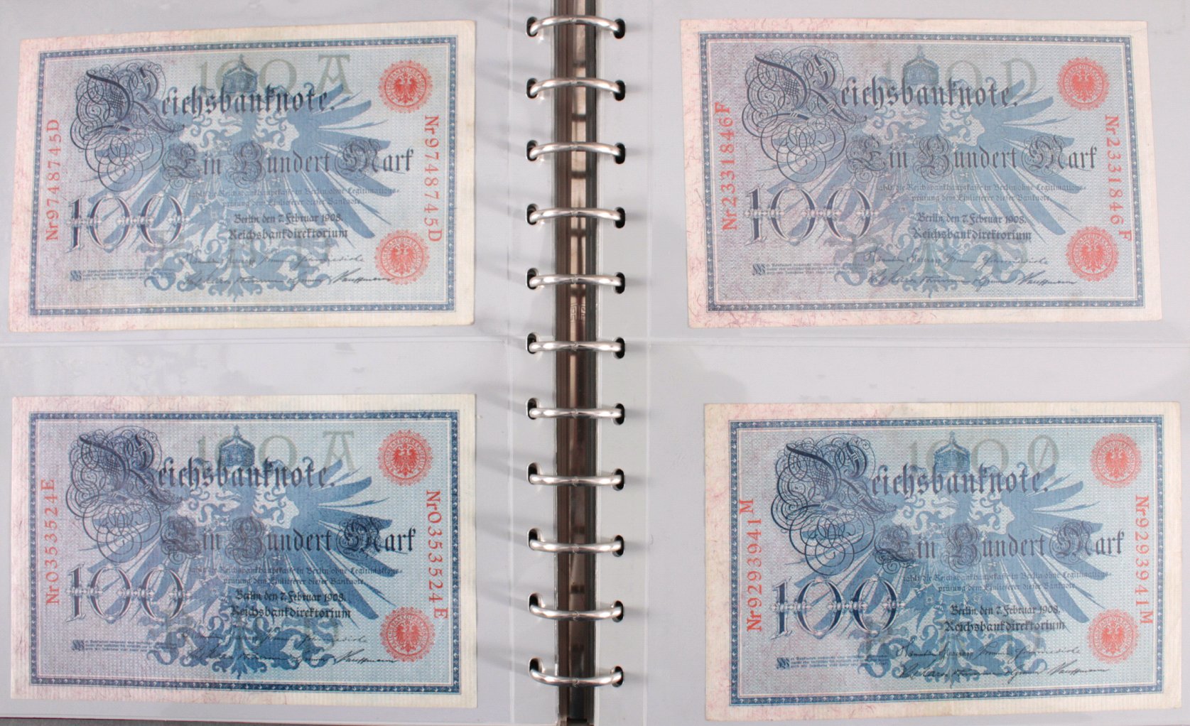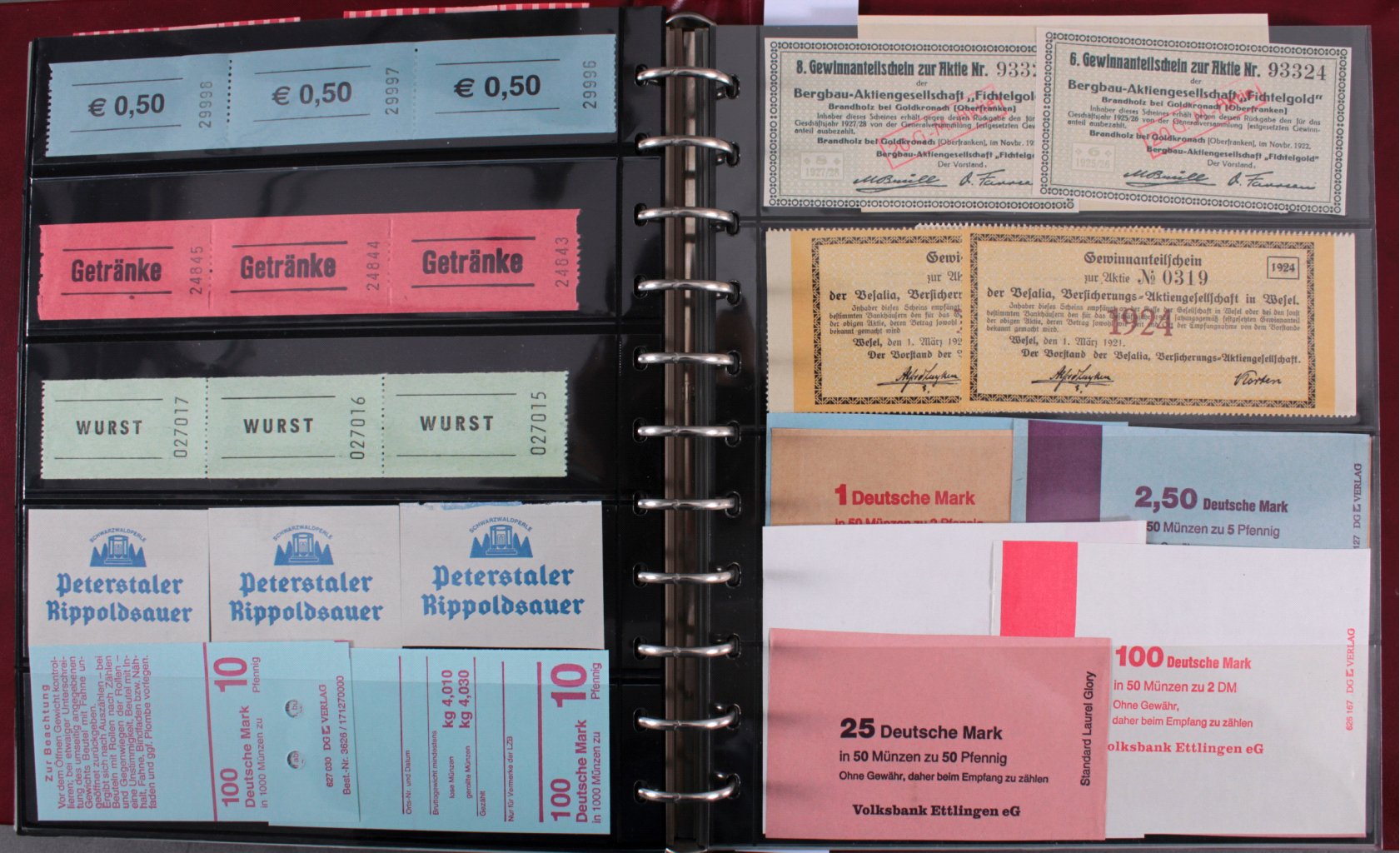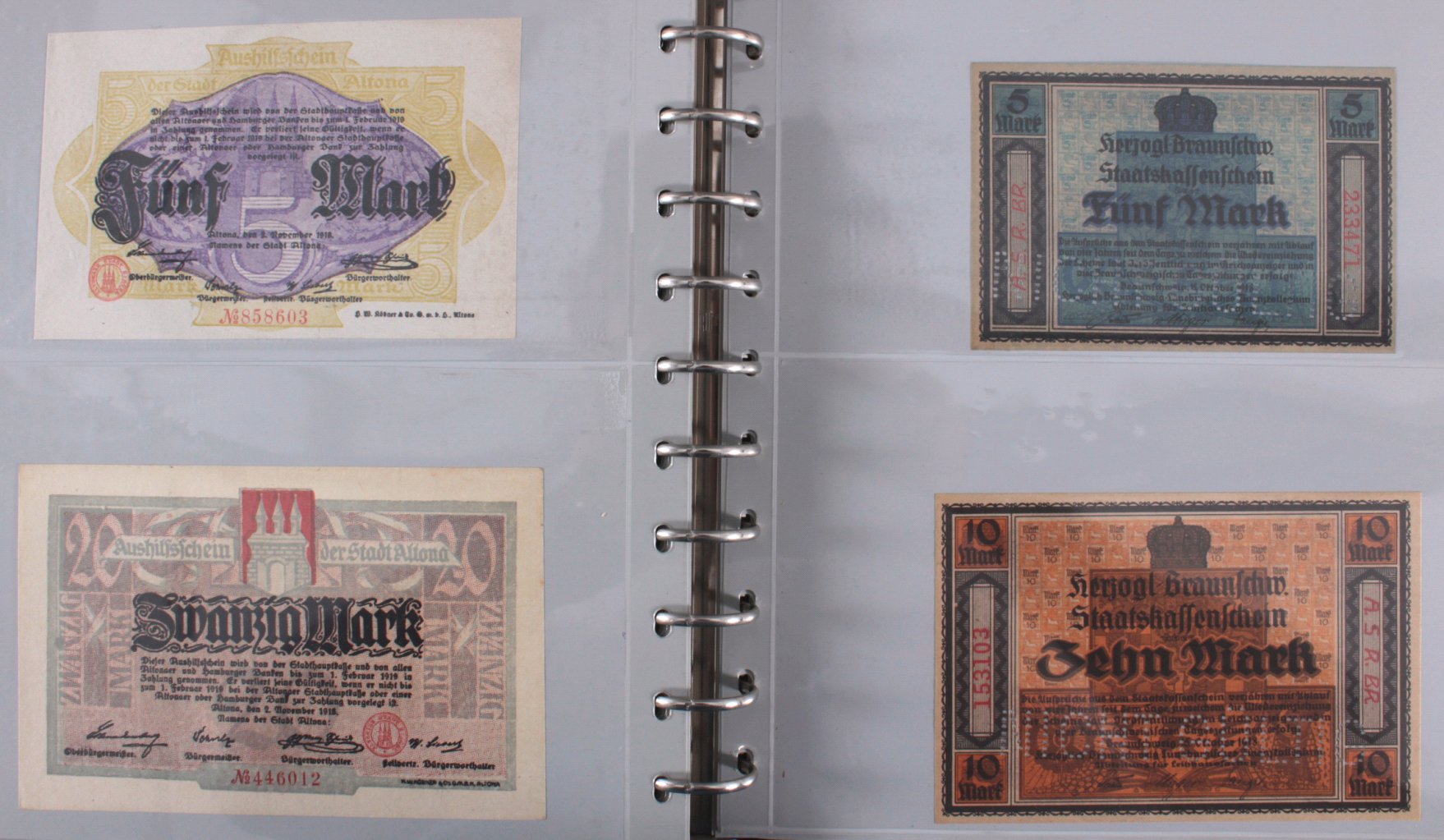Album mit wohl über 200 verschiedenen deutschen Banknoten und Notgeldscheinen in guter bis sehr guter Erhaltung. Dabei viele seltene Scheine, dabei auch Banderolen und div. Marken
