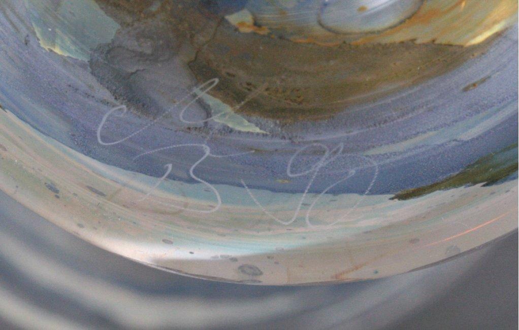 Klarglas, farbige Schliereneinschmelzungen runder Standfuß. Fuß geätzt „M B 90“. ca. H-22cm