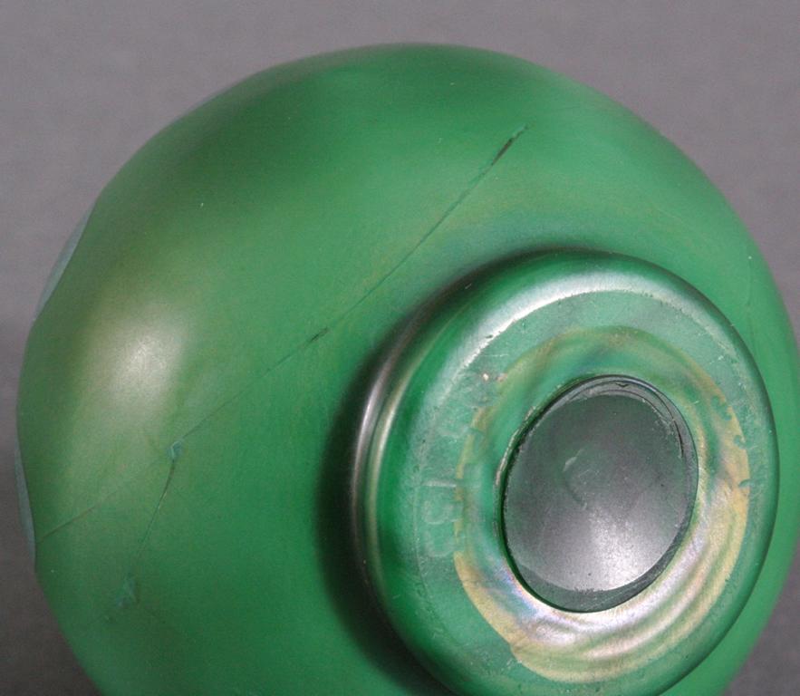 1x Louis Comfort Tiffany, 20. Jh. Favrile-Glas. Balusterförmiger Korpus, partiell opakweiß überfangen und irisiert sowie mit grün gekämmter Fadenauflage. Am Boden geätzt „L.C.T.“, Modellnr. 25933, ca. H- 10 cm. Materialsprung. 1x Vase aus farblosem Glas mit grünem Überhang, aufgesetzten Blüten und prunkvoller Ornamentbemalung in Gold, am oberen Rand beschädigt, ca. H- 16 cm.