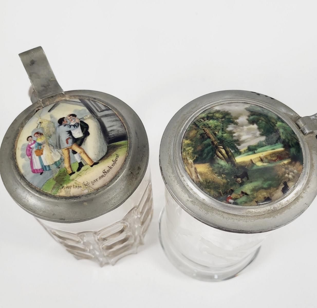 2 Krüge aus Glas mit Deckel aus Zinn mit Porzellanbild