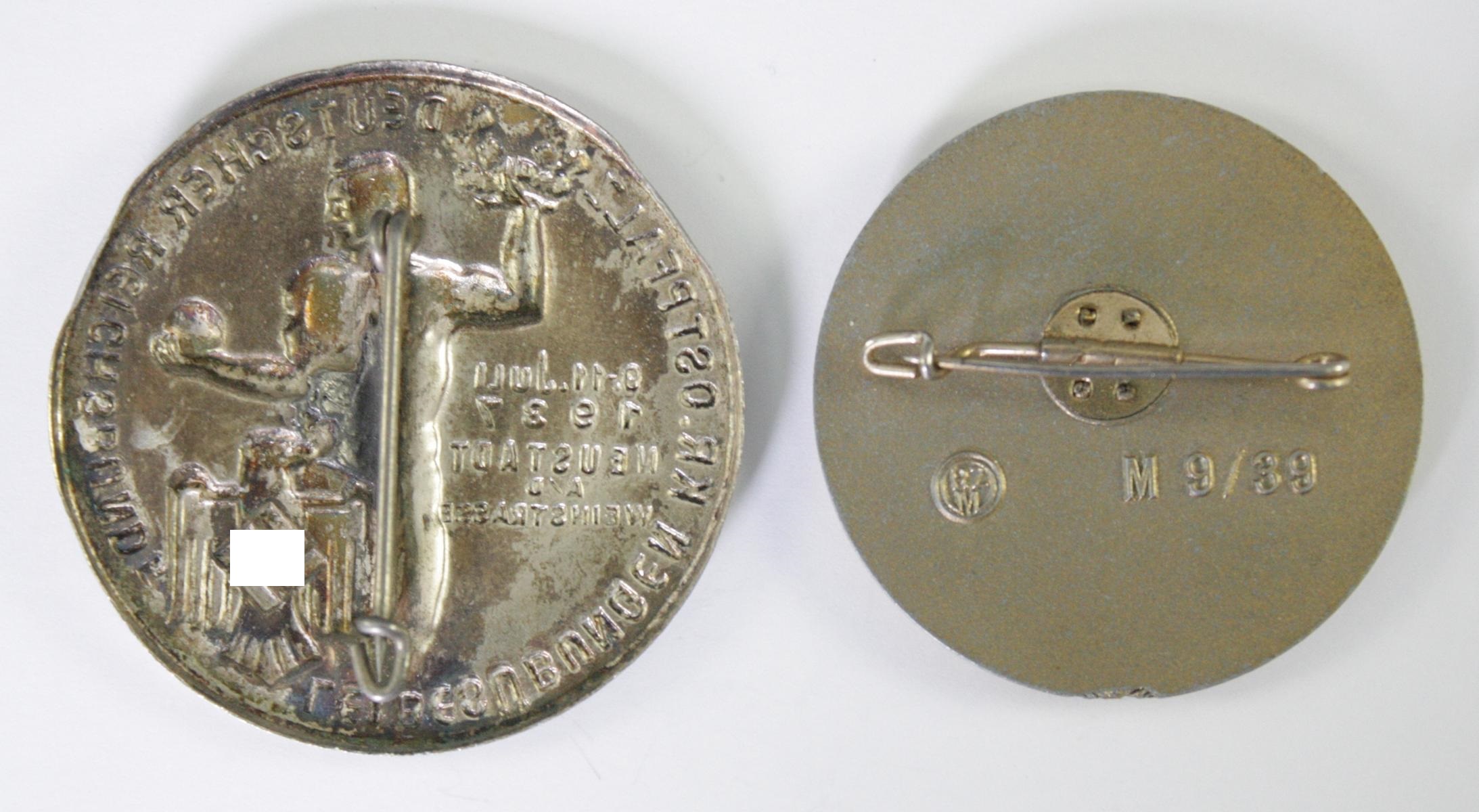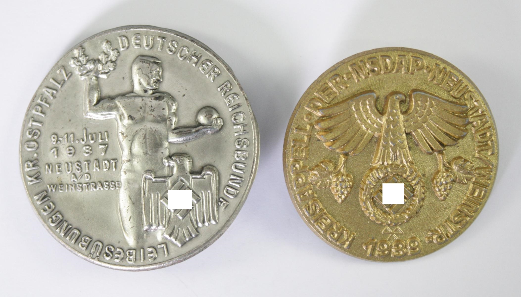 1x Kreisappel der NSDAP 1939. Metall, hohl geprägt. Durchmesser ca. 3,5 cm.1x Deutscher Reichsbund für Leibesübungen – Kreis Ost-Pfalz. 9.-11. Juli 1937. Metall hohl geprägt. Durchmesser ca. 4 cm.