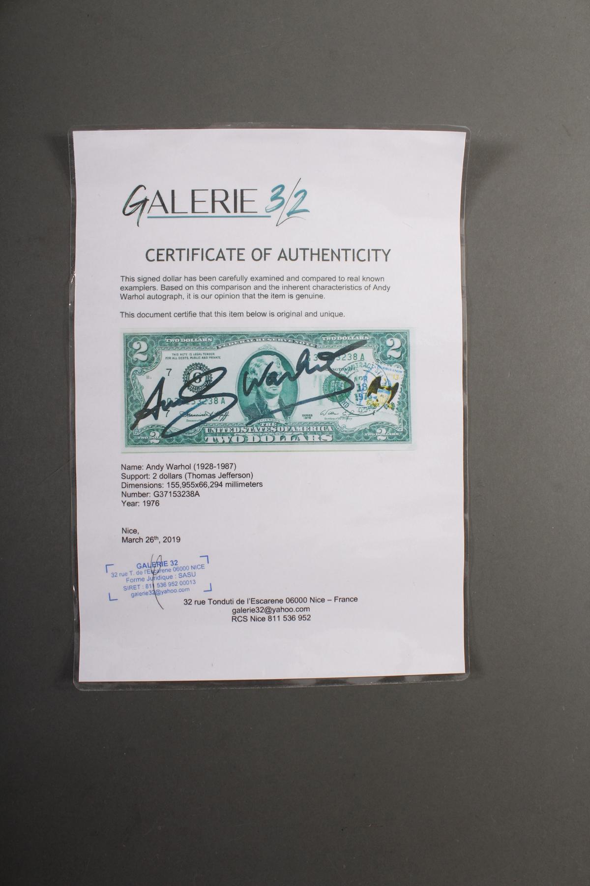 Two Dollar Jefferson (1976), Handsigniert.Handsigniertes original mit Echtheitszertifikat einer französischen Galerie.Maße ca. 15,6 x 6,6 cm.Gerahmt im Acrylrahmen.