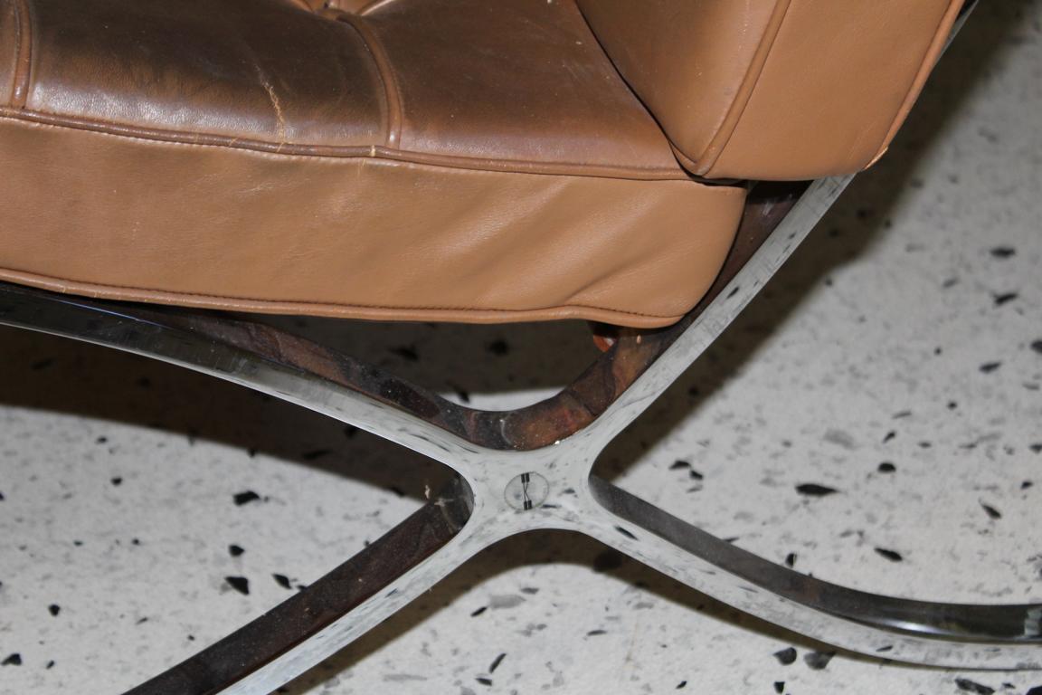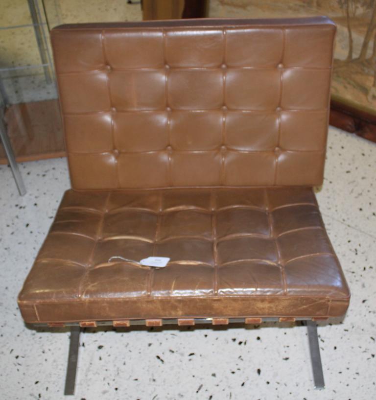 Entwurf: Ludwig Mies van der Rohe, 1929, Ausführung: Knoll International(?), wohl 1970er/80er Jahre. Gestell verchromter Stahl, Sitz- und Rückenkissen aus braunem Leder mit Knopfheftung auf Unterlage aus braunen Ledergurten. Gebrauchsspuren.Maße ca. 77 x 77 x 77 cm.