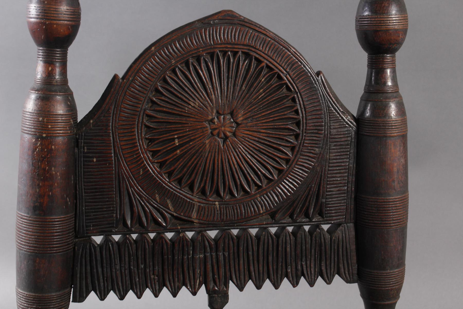 Reich verzierter Stuhl aus Tropenholz mit Ledersitzgeflecht im originalen Zustand.Altersbedingte Gebrauchsspuren.Höhe ca. 78 cm, Breite ca. 44 cm.