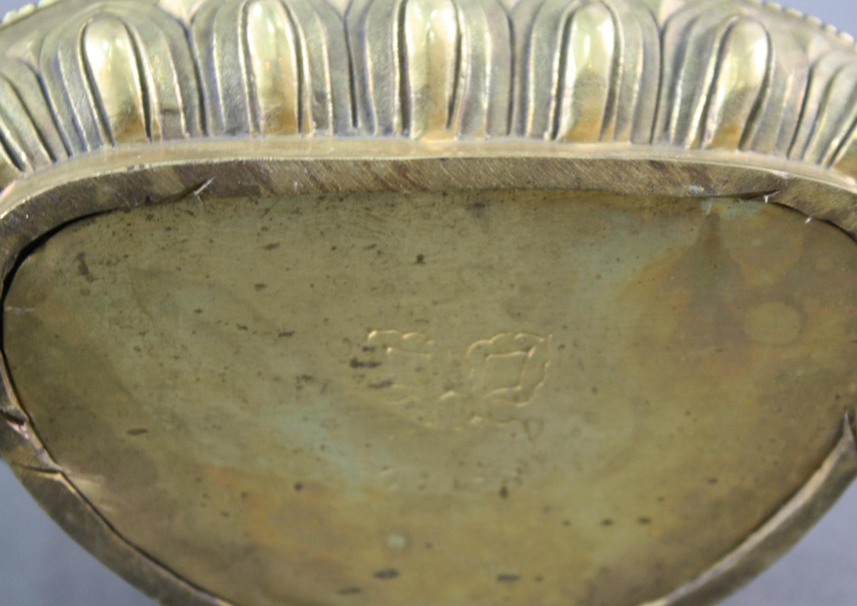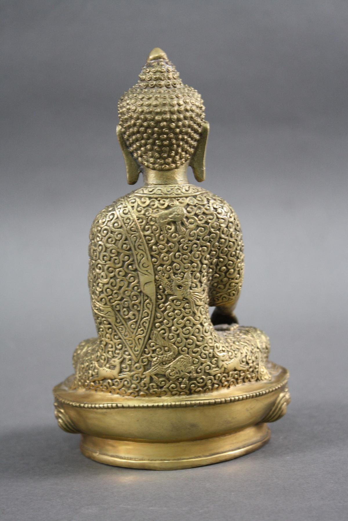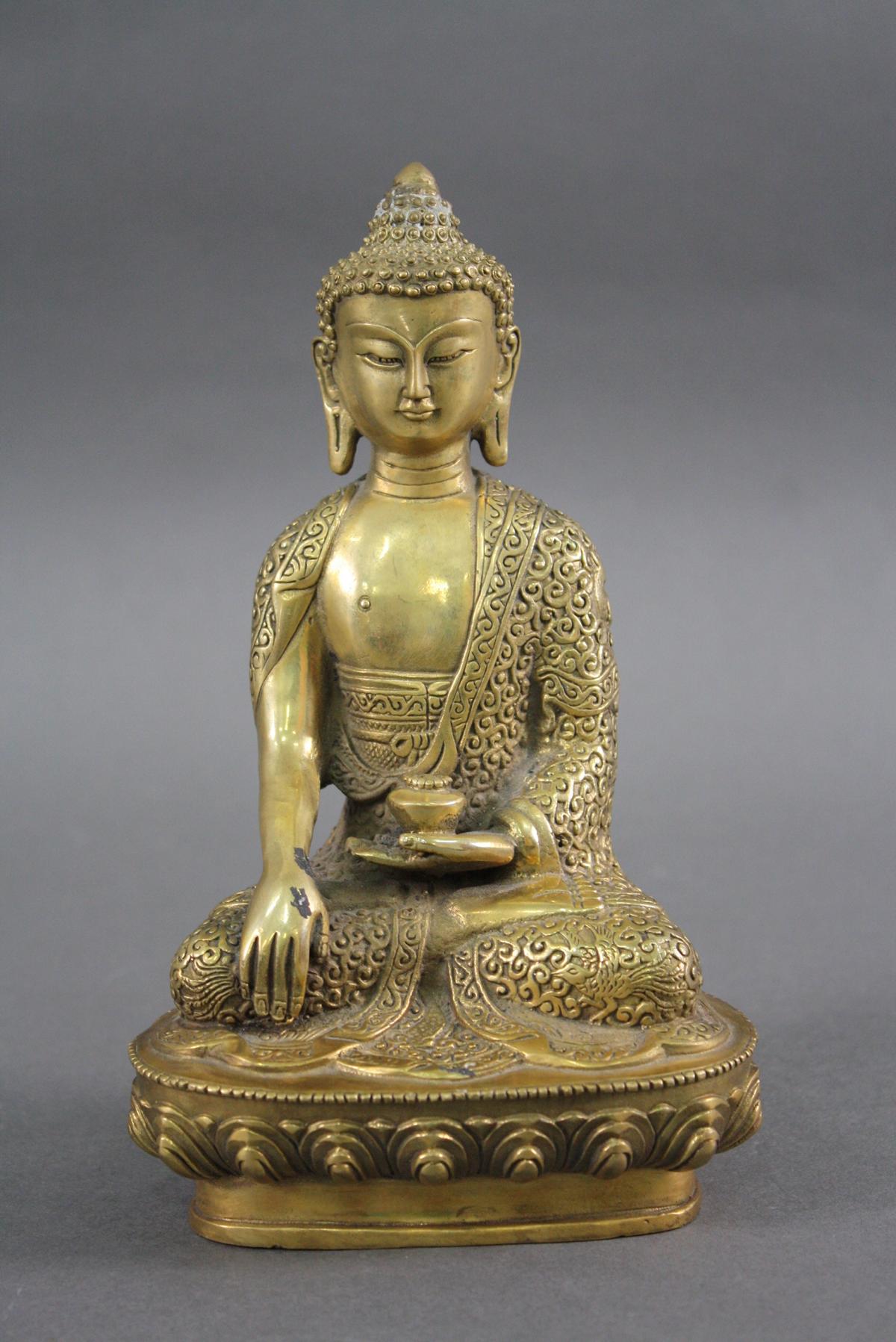 Auf Lotussockel, Dhyana Asana. Bhumisparsa Mudra. Unter dem Stand geprägte Punze, Höhe ca. 19 cm