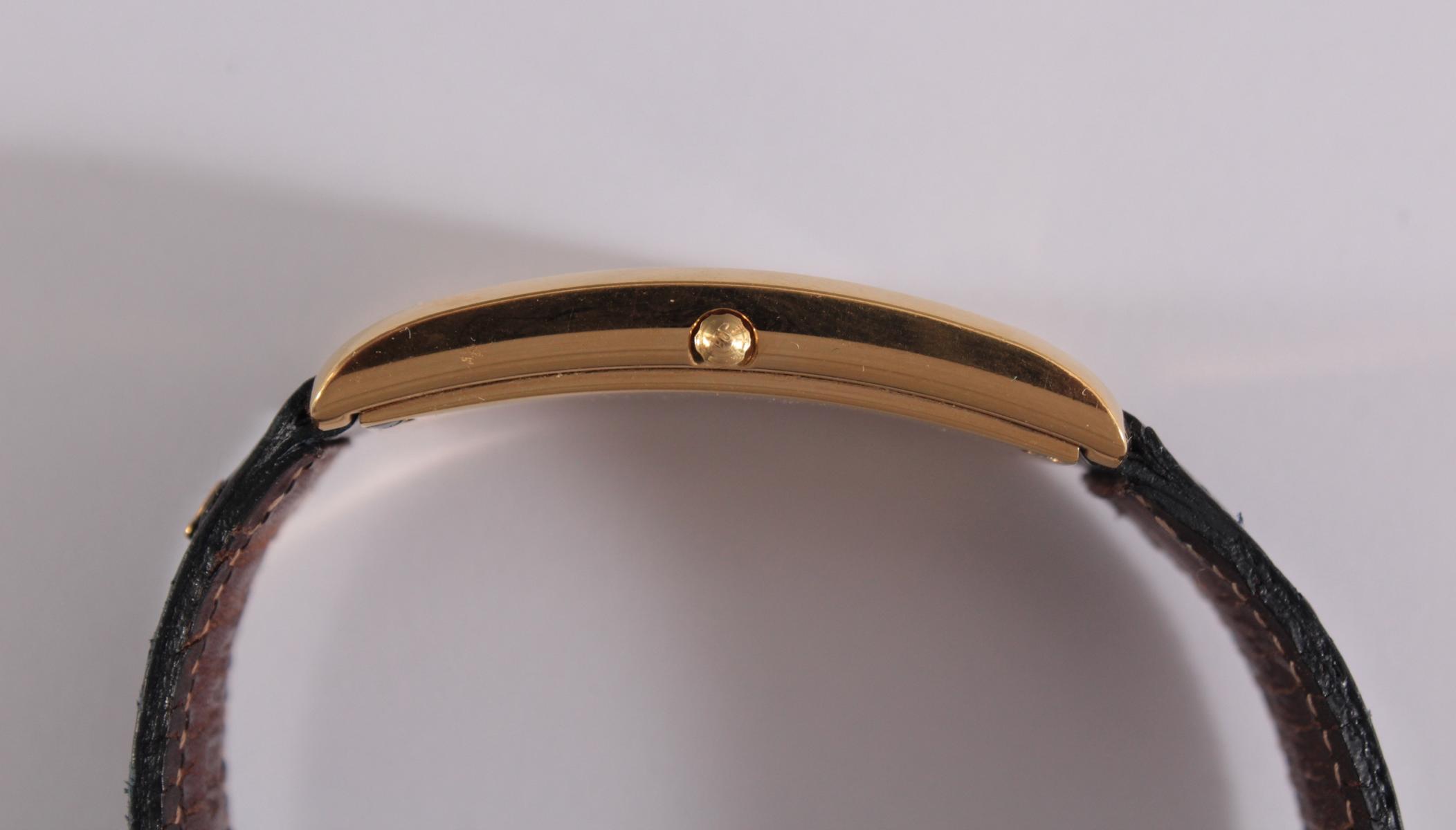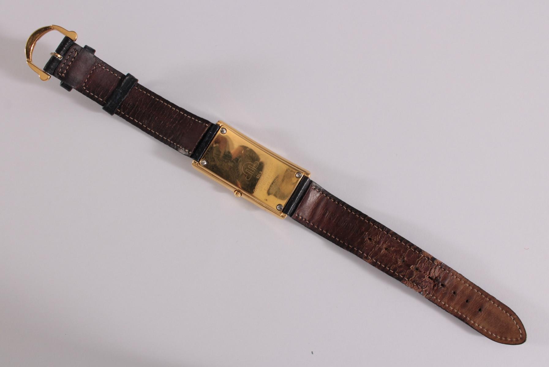 Dunkles Zifferblatt mit arabischen Ziffern, Strich-Indizes und Firmensegment, Quarzwerk, vergoldetes Gehäuse, Lederarmband, Nr. 47496 12030, Intakt, mit Garantie und Gebrauchsanweisung.