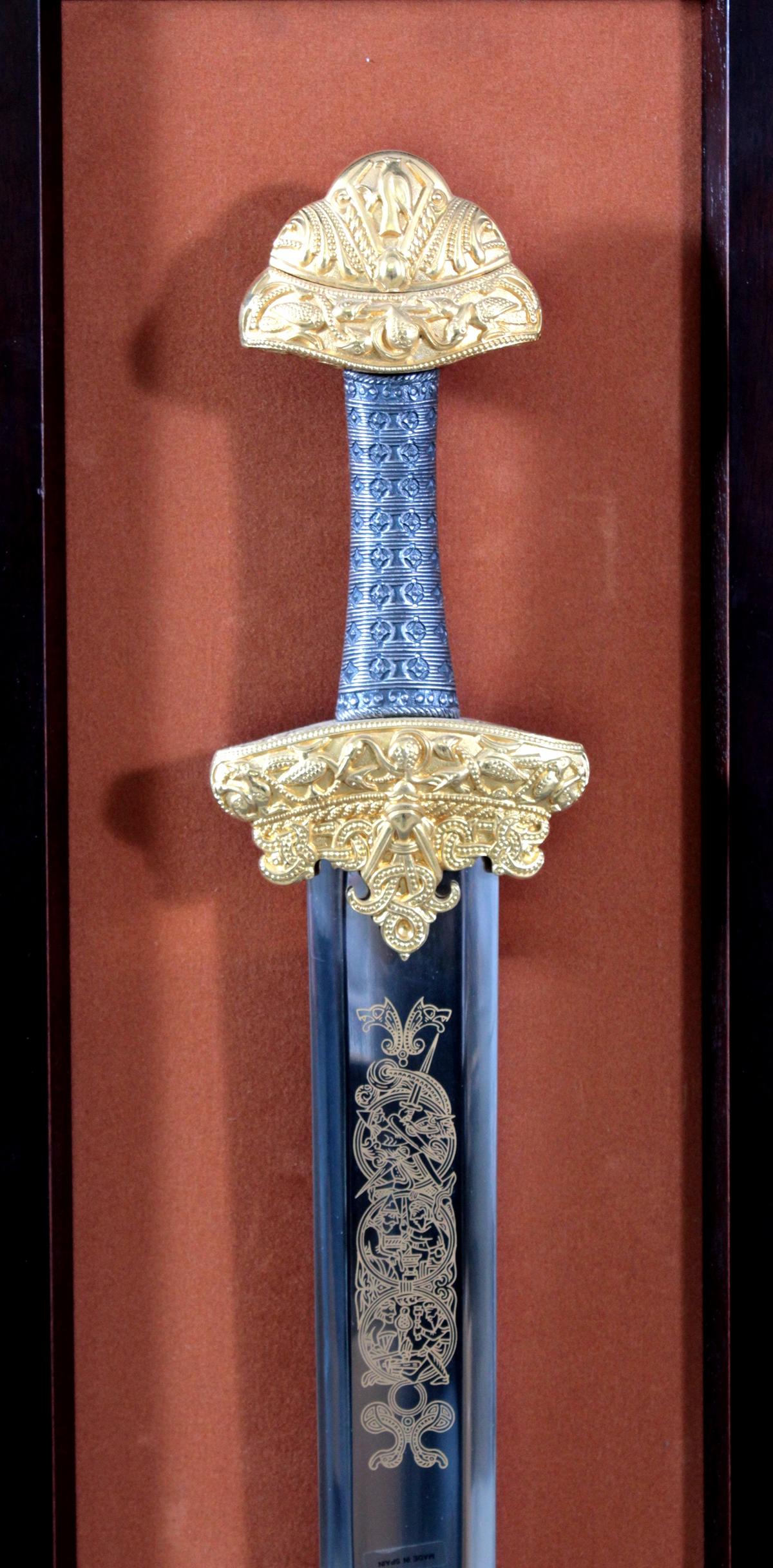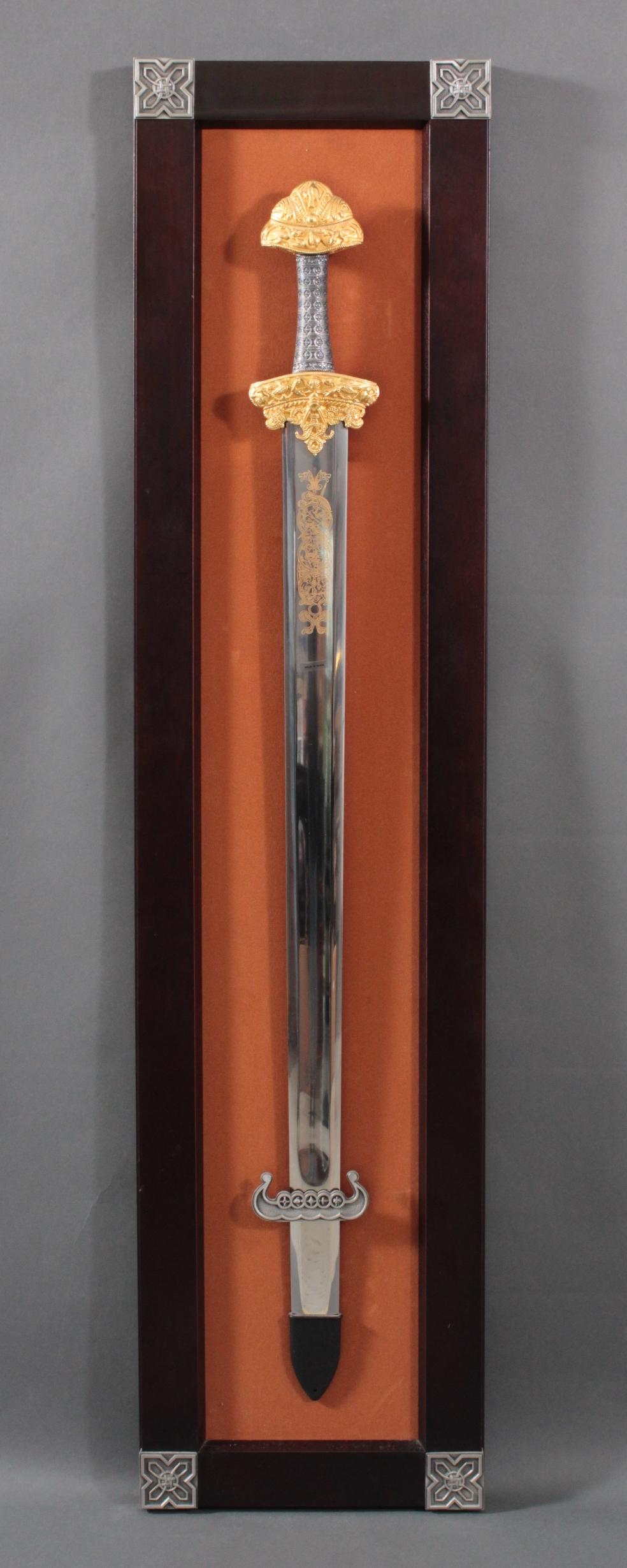 Schwert-Replik mit gold- und silberfarbenem Griffstück. Auf Holzplatte mit Samteinschlag und Eckverzierungen aufgesetzt.Länge der Schwertes ca, 99 cm.Gesamtlänge der Holzplatte ca. 118 cm.