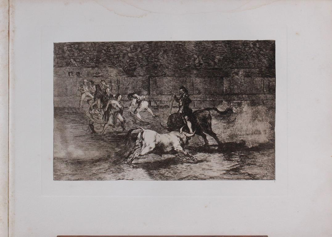 Aquatintaradierung 19. Jahrhundert. Stierkampf.Plattenmaß ca. 24,5 x 35,5 cm.Blatt außerhalb der Platte mit Wasserrändern und Stockflecken; Motiv sauber