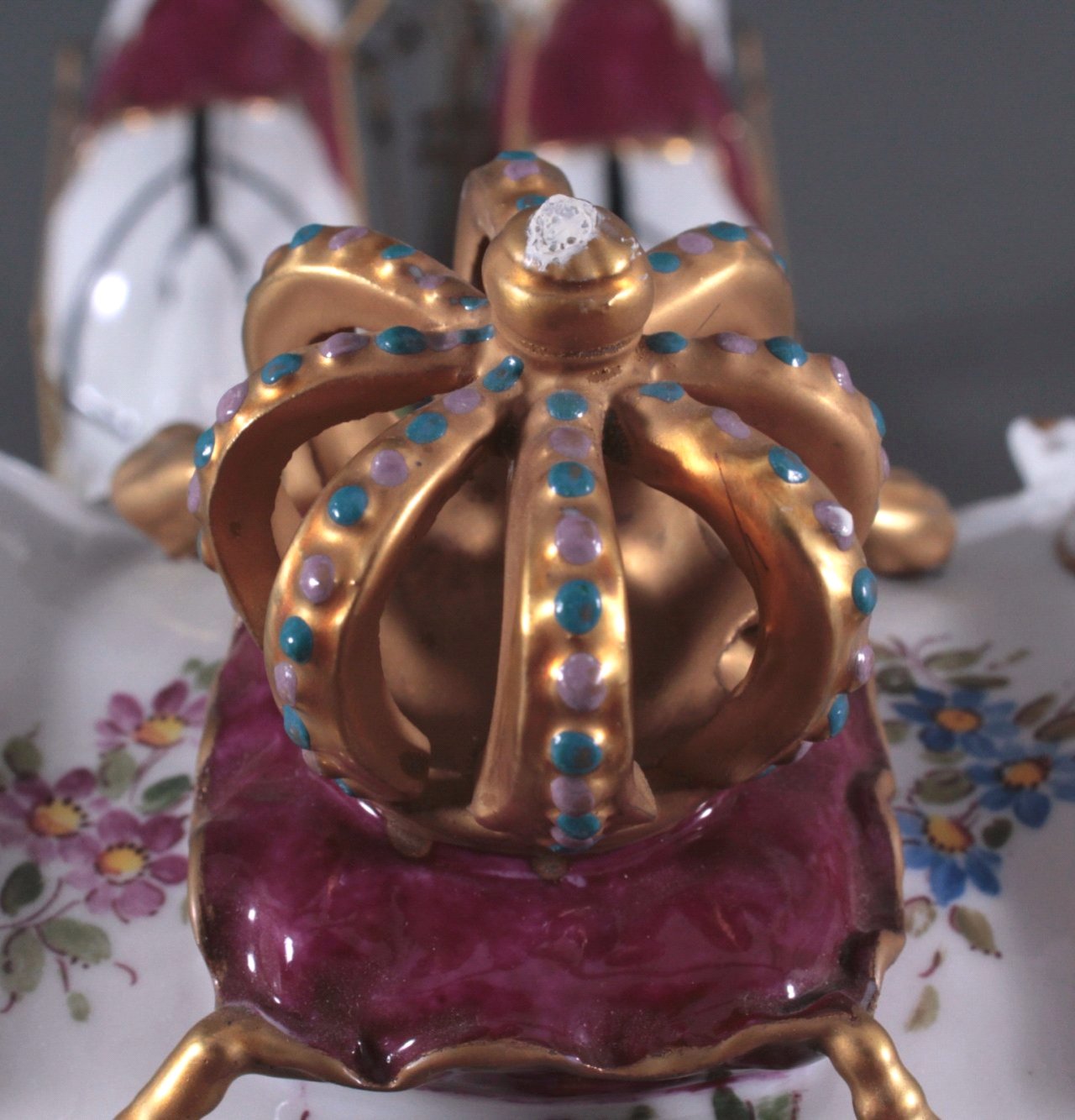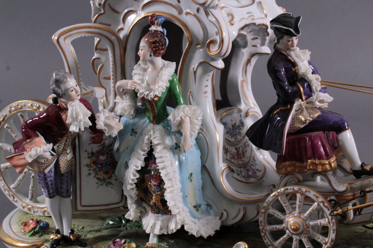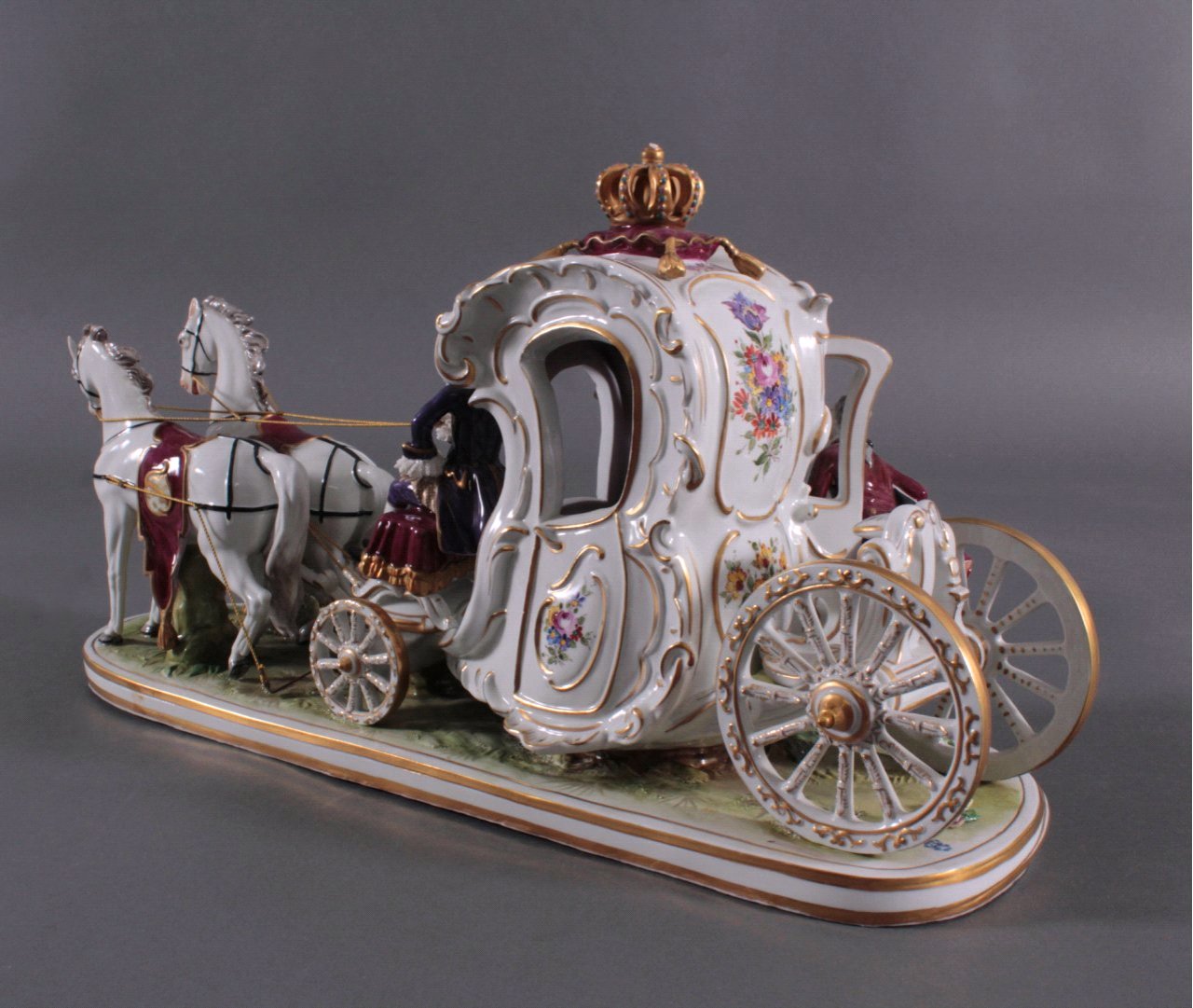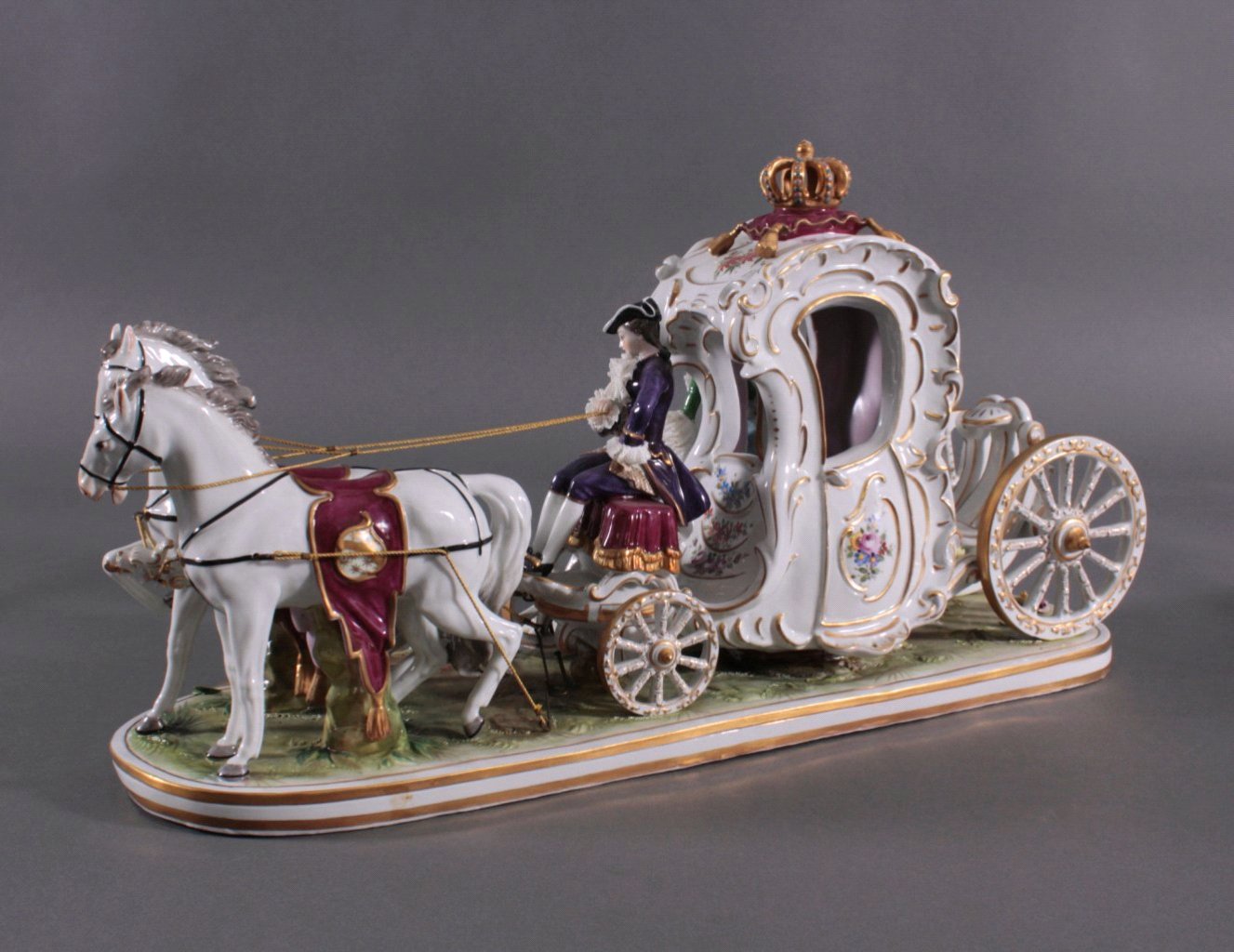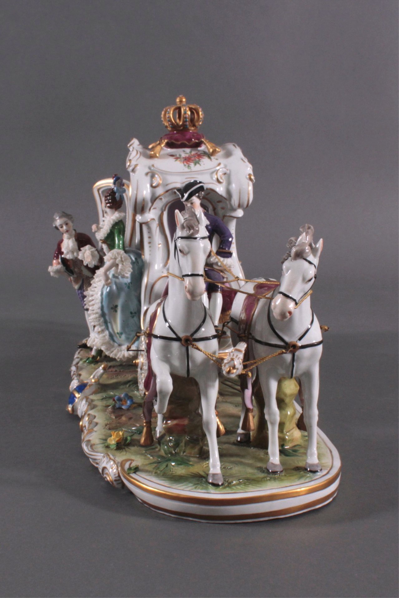 Aelteste Volkstedter Porzellanfabrik, Volkstedt. Porzellan, polychrome Aufglasurbemalung, goldstaffiert, vollplastische Darstellung einer vierspännigen Kutsche in üppigen Barockformen mit höfischem Glanz, mit drei Figuren auf länglichem Landschaftssockel mit randumlaufenden, goldstaffierten Rocaillen und plastische Blüten. Unter der Glasur blaue Marke, Spitze der Krone bestossen, ca. 30 x 59 x 20 cm