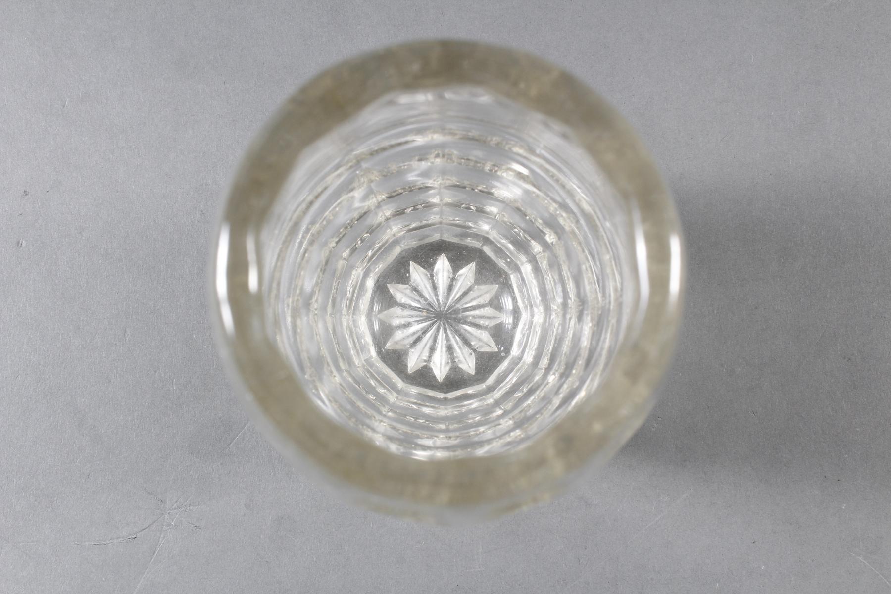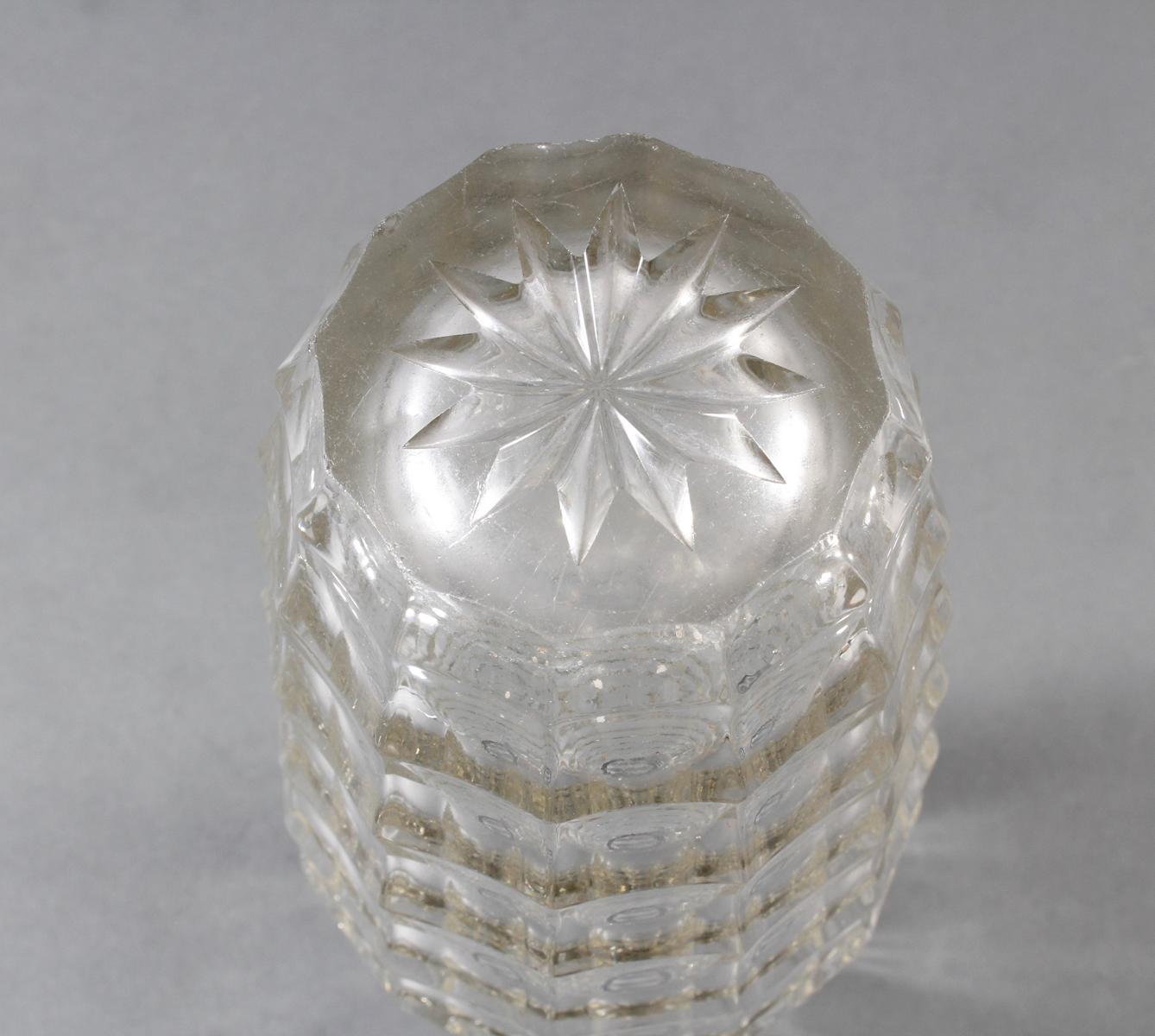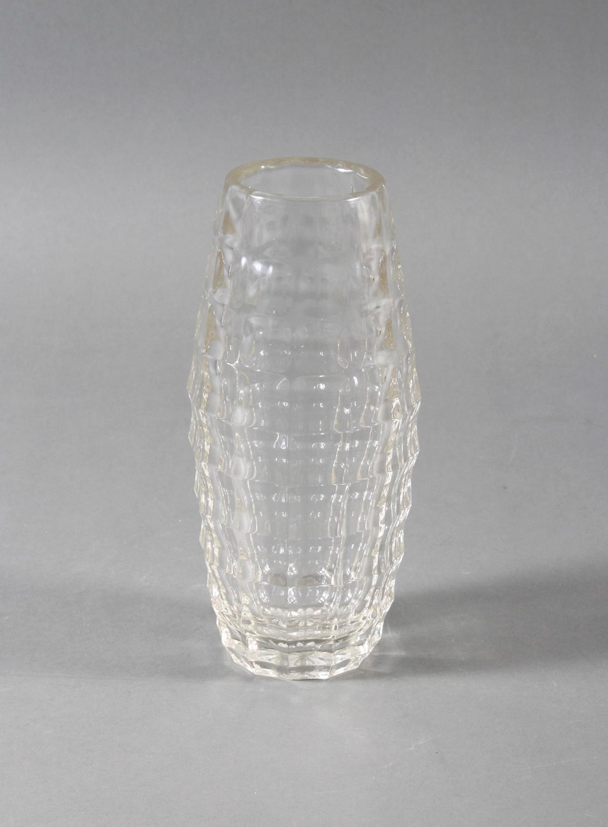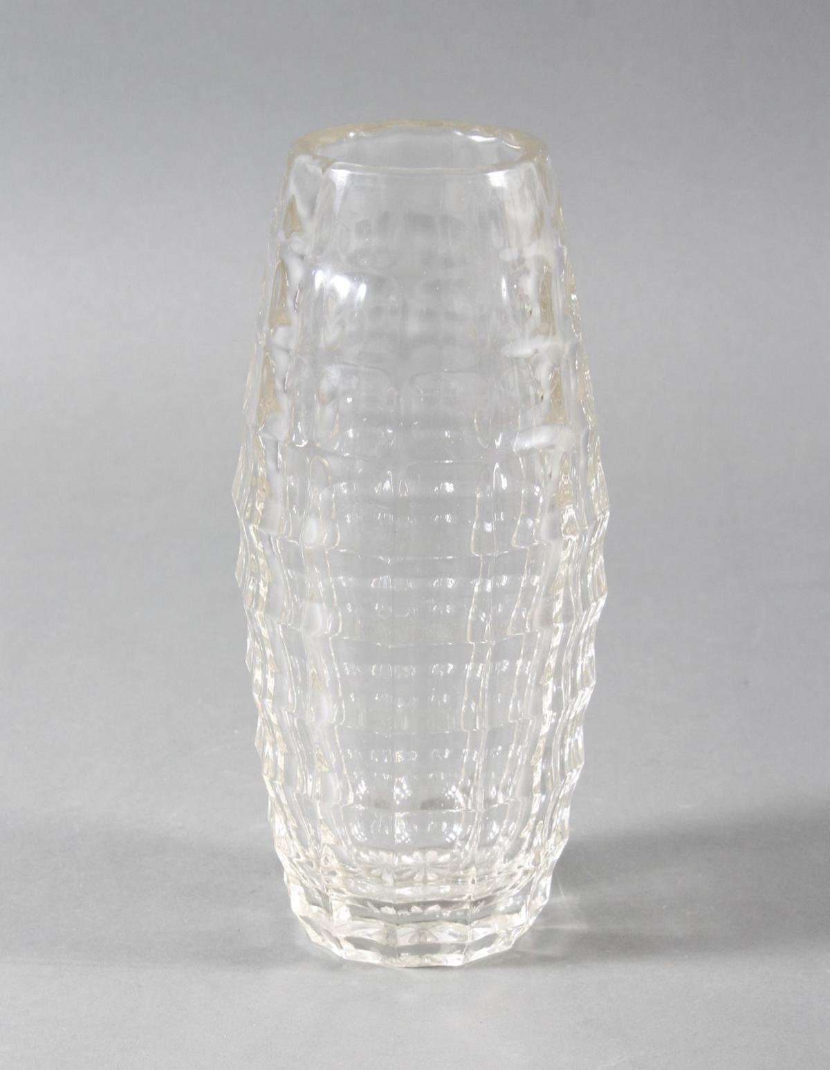 Leicht gebrauchter Korpus mit facettierten Stand. Farbloses Glas mit quadratischen Muster. Höhe ca. 23 cm. Standkante mit kleinen / unwesentlichen Bestoßungen.