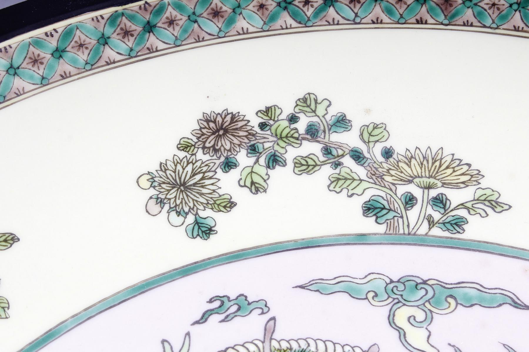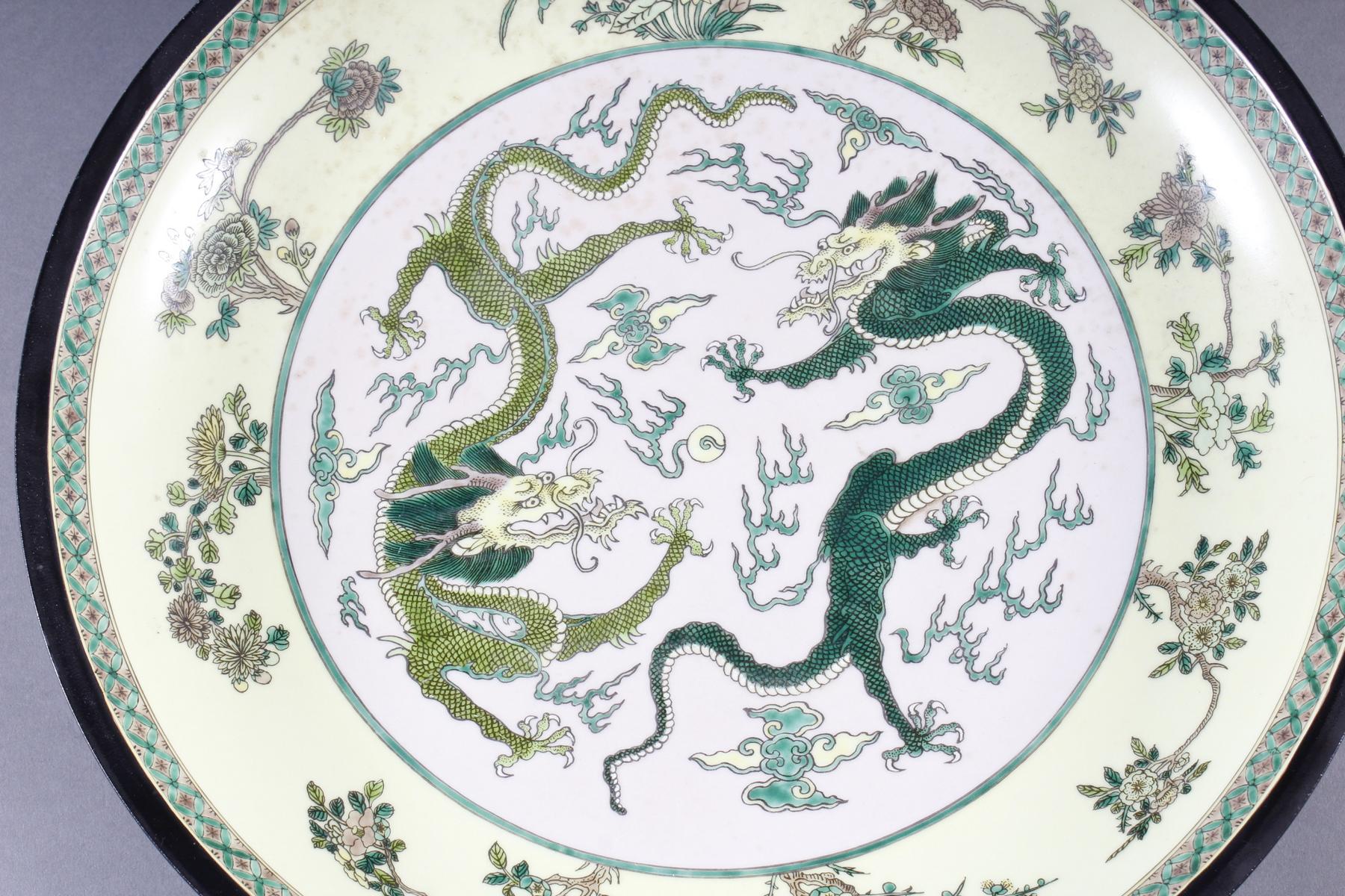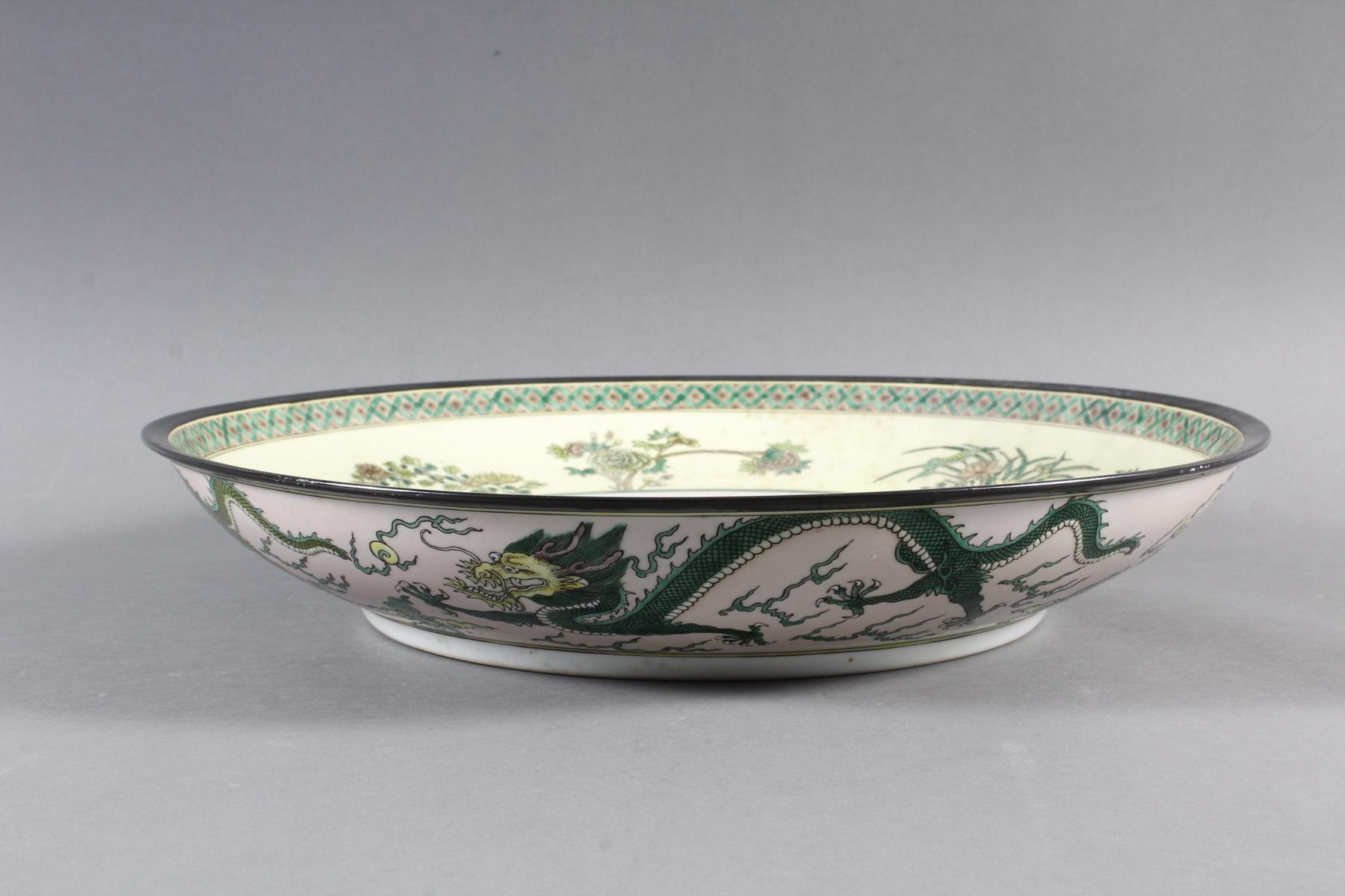 Runde Porzellanschale, polychrome Drachen- und Blumenbemalung, blaue 6 Zeichen Marke, ca. Höhe 8 cm, Durchmesser 43 cm.