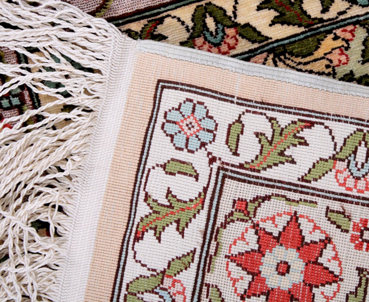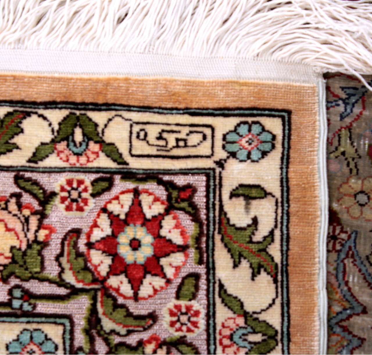 Knotendichte 10×10, Seide auf Seide, vergoldete Silberfäden, Maße ca. 93cm x 62cm (ca. 0,57m²)