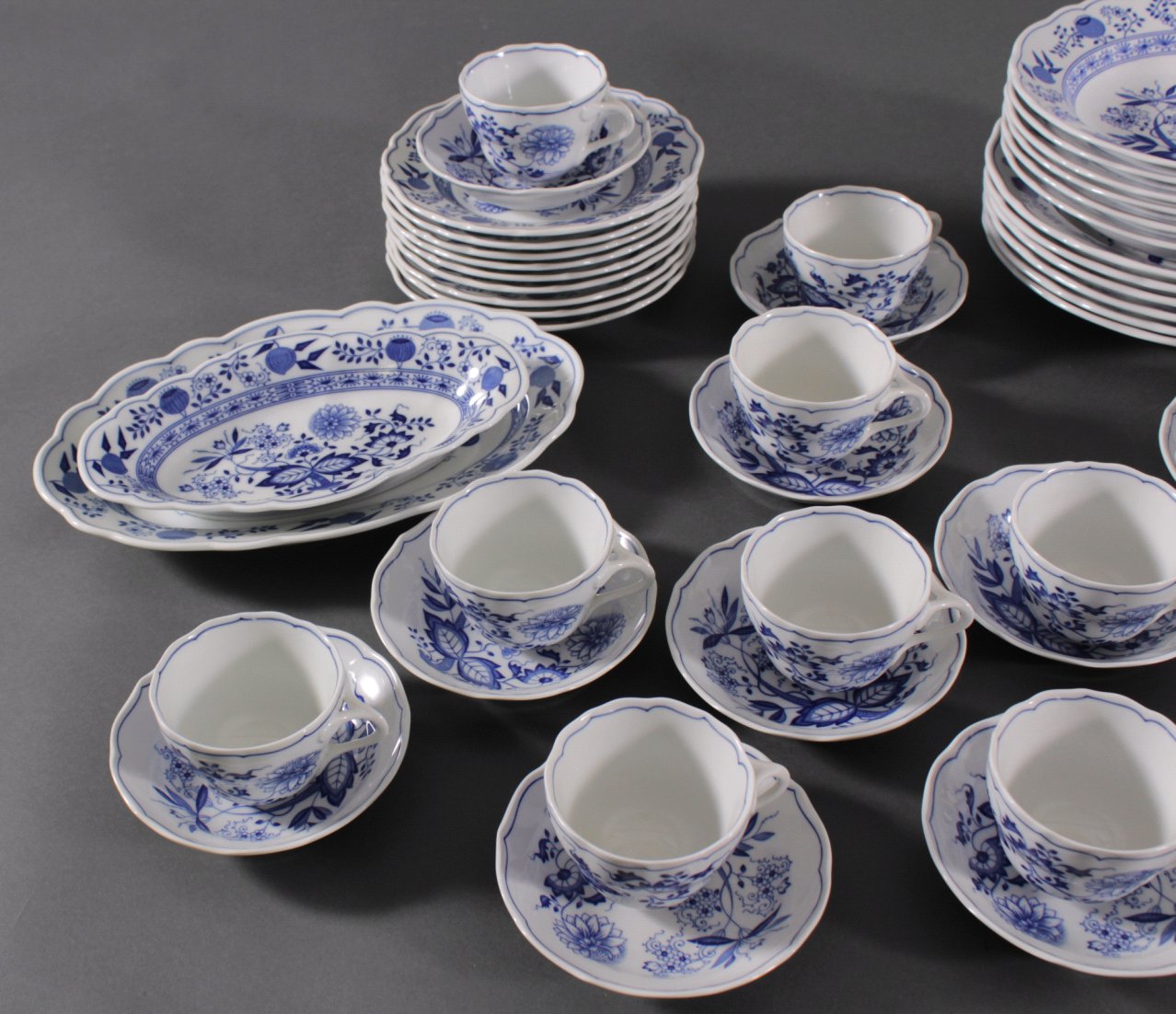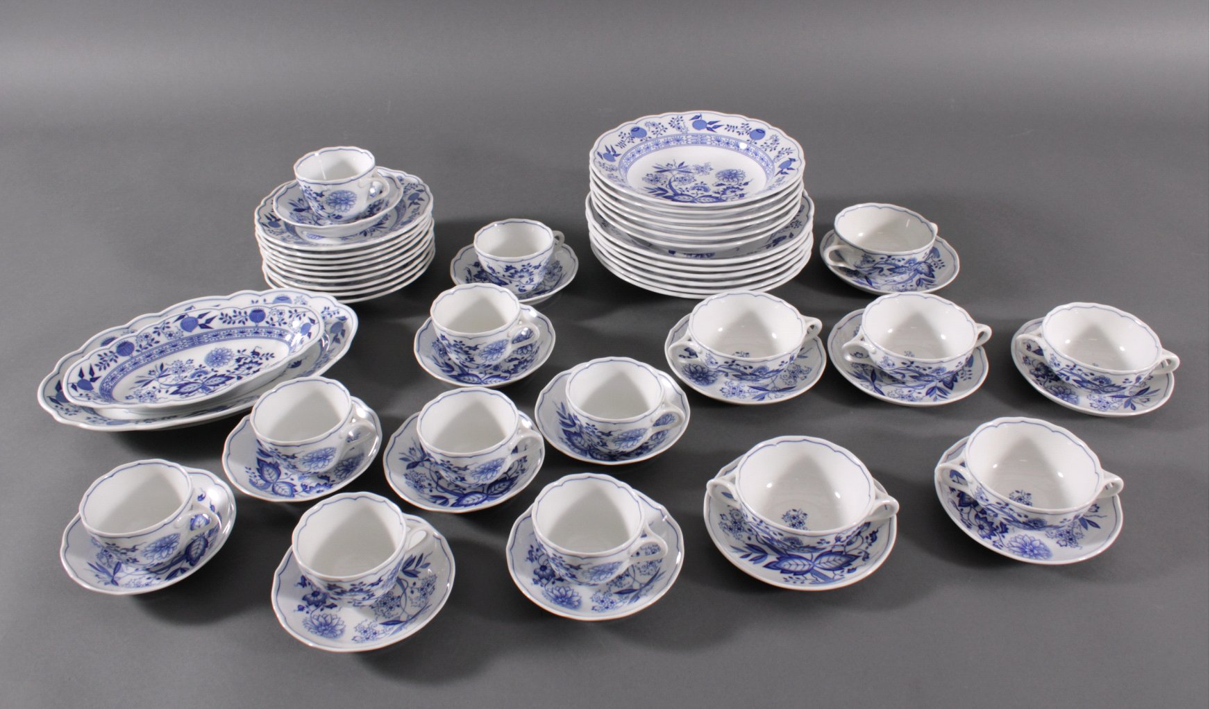 53-teilig. Zwiebelmusterdekor, Unterseite gemarkt. 6 Suppentassen ca. H- 5,2 cm. 6 Suppenuntertassen ca. D- 16 cm. 9 Kaffeetassen ca. H- 6,5 cm. 9 Untertassen ca. D- 14 cm. 9 kleine Teller ca. D- 19,5 cm. 6 große Teller ca. D- 25 cm. 6 Suppenteller ca. D- 23 cm 2 ovale Anbietschalen ca. L- 24,5 cm und 30,5 cm.