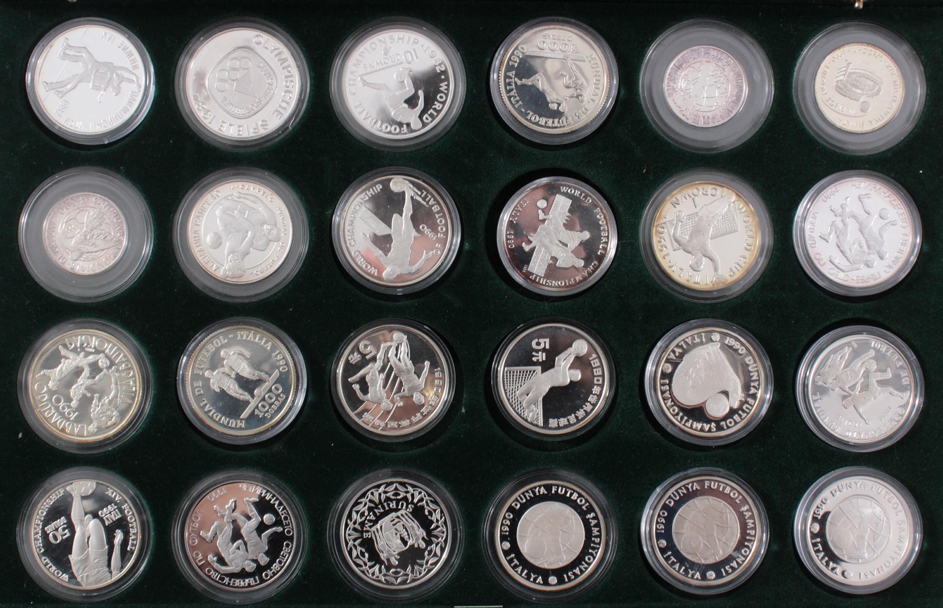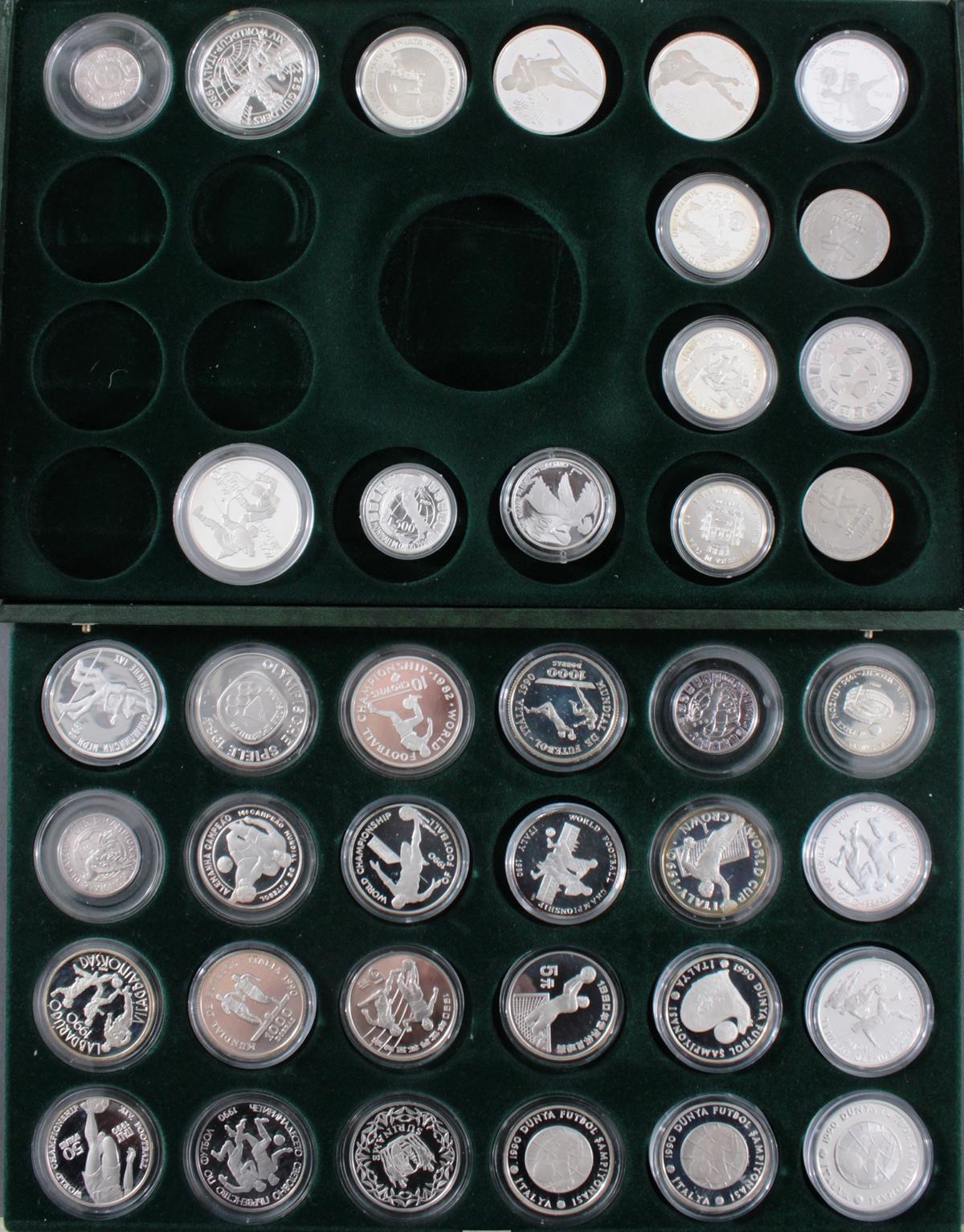 39 Silbermünzen davon 35 in Münzkapsel, in grüner Samtschatulle.