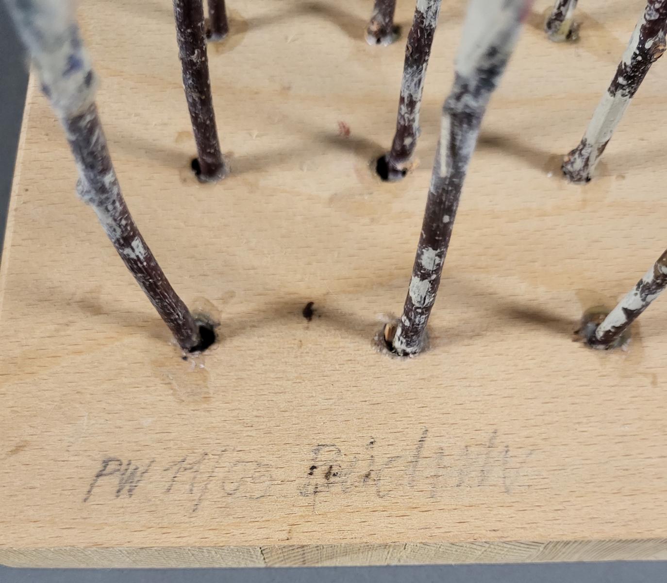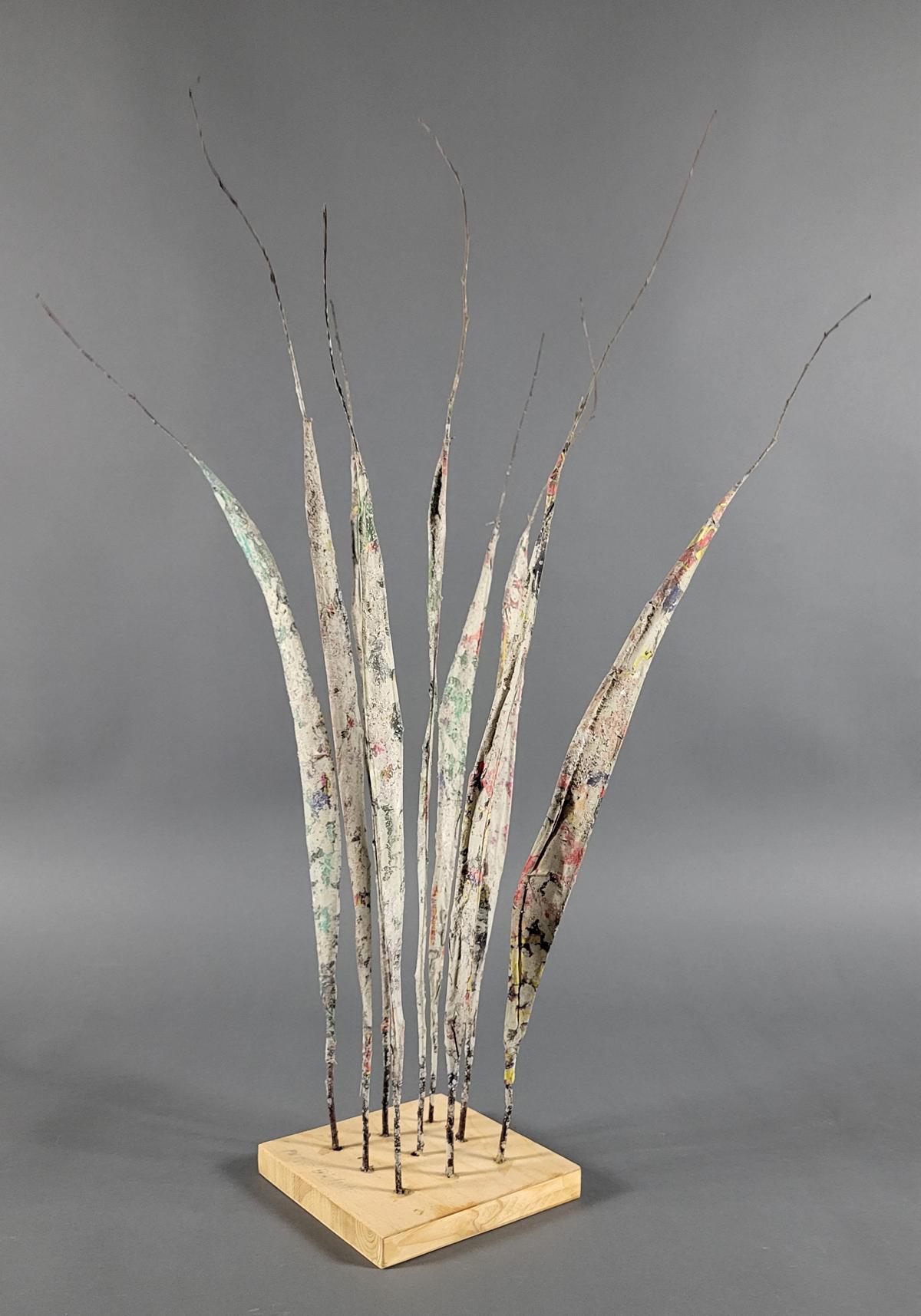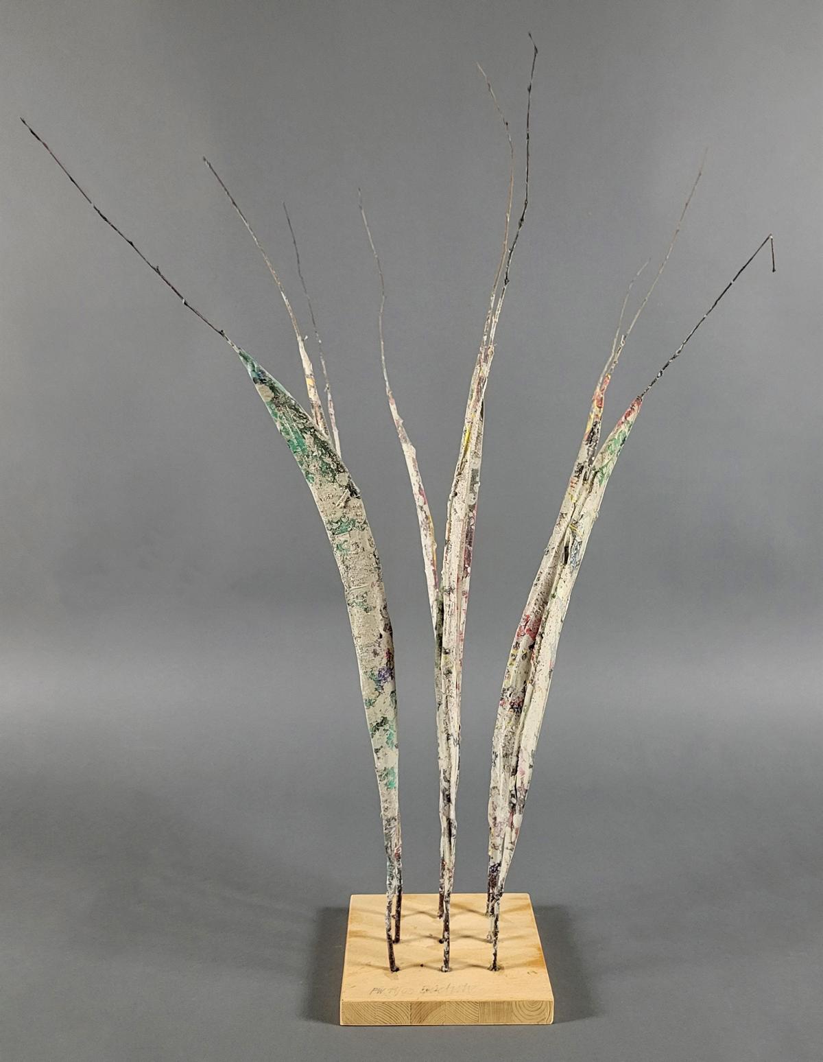 Weide/buntes Papier/Asche auf Holzsockel signiert, ca. 73 x 17 x 17 cm
