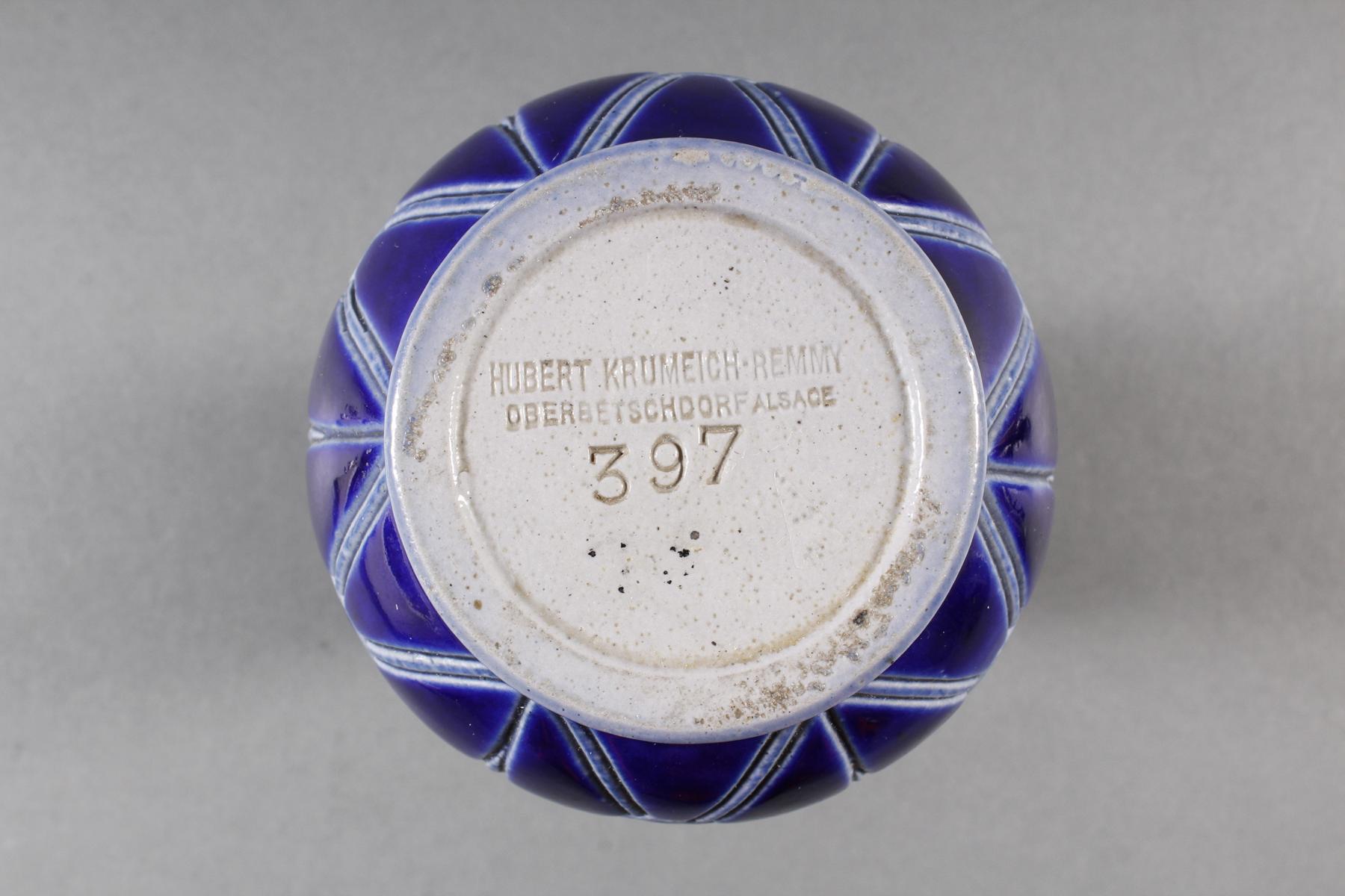 Bodenunterseite gemarkt: Hubert Krummeich-Remmy / Oberbetschdorf Alsace. Dekor im Stil von Peter Behrens. Produktionsnummer 397. Höhe ca. 15 cm.
