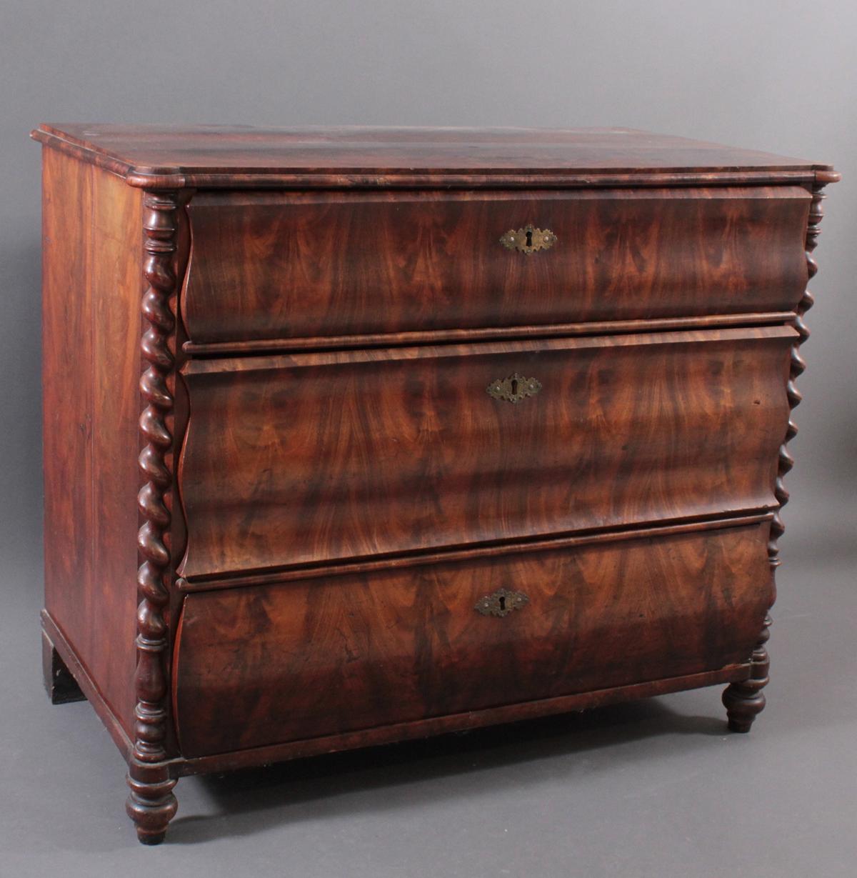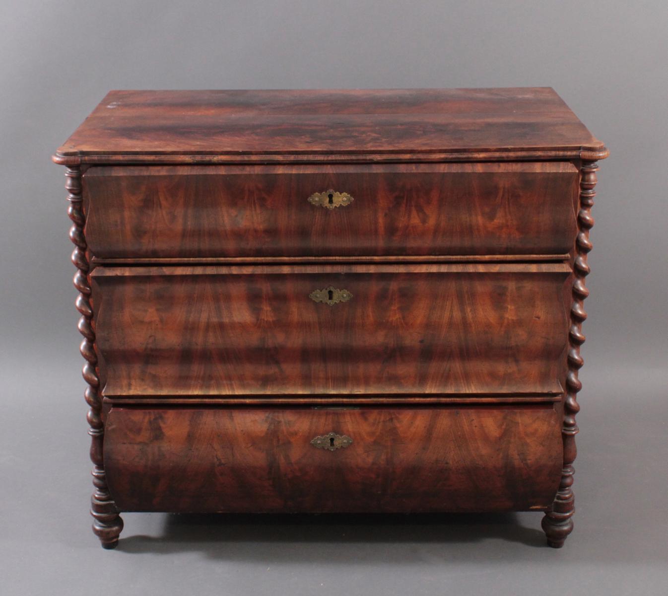 3 Schubladen, mit Schloss, ohne Schlüssel, Weichholz-Korpus Nussbaumfurniert, ca. 84 x 97 x 51 cm.