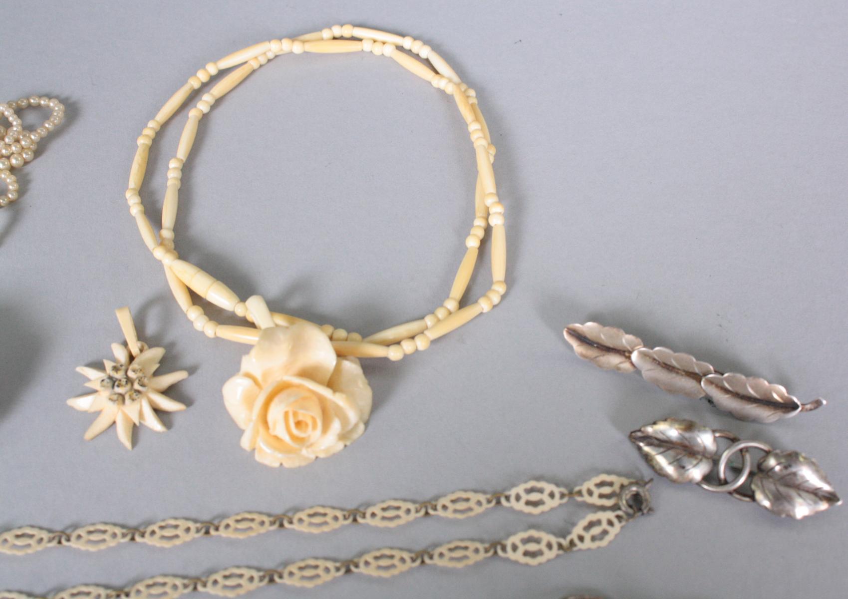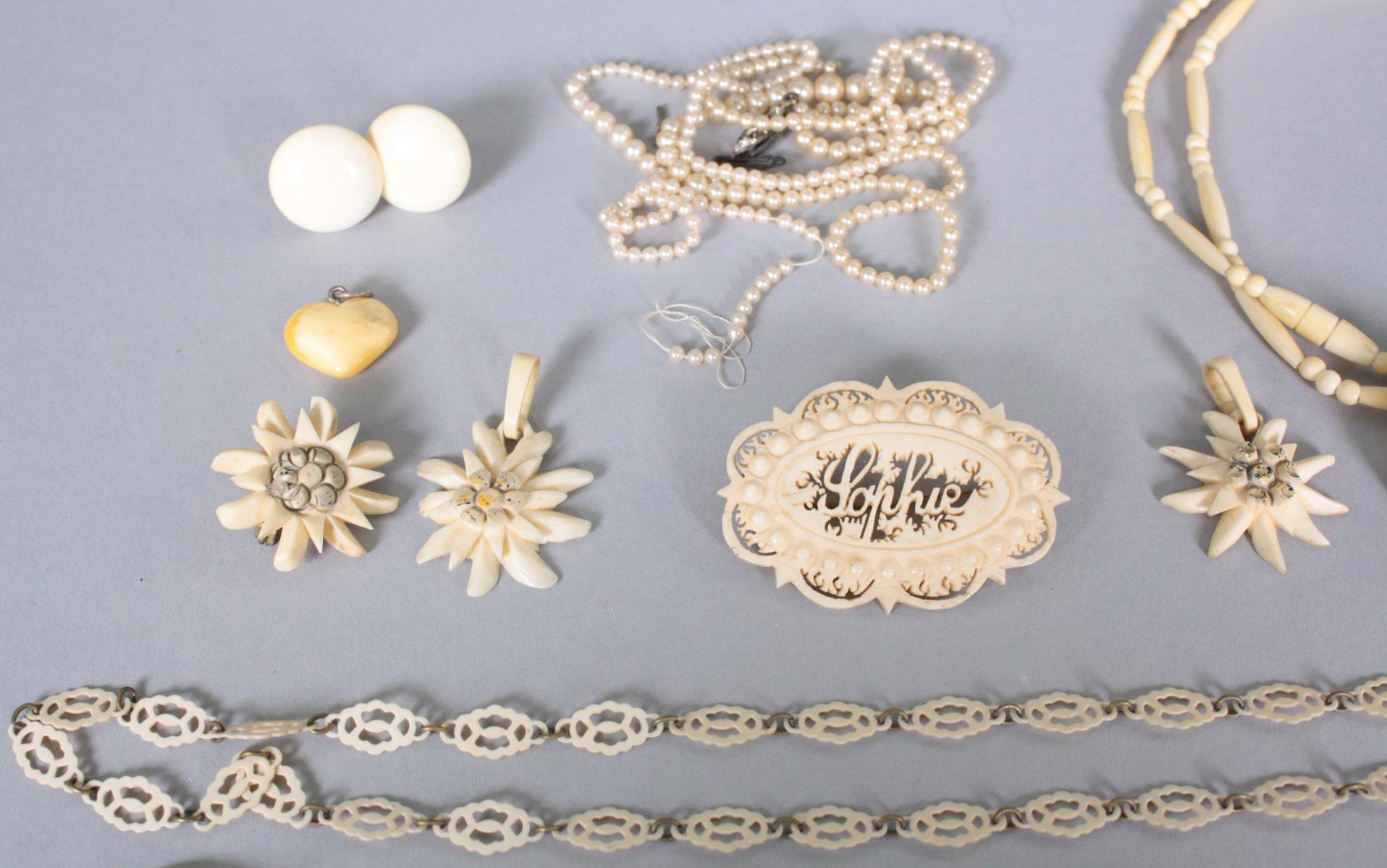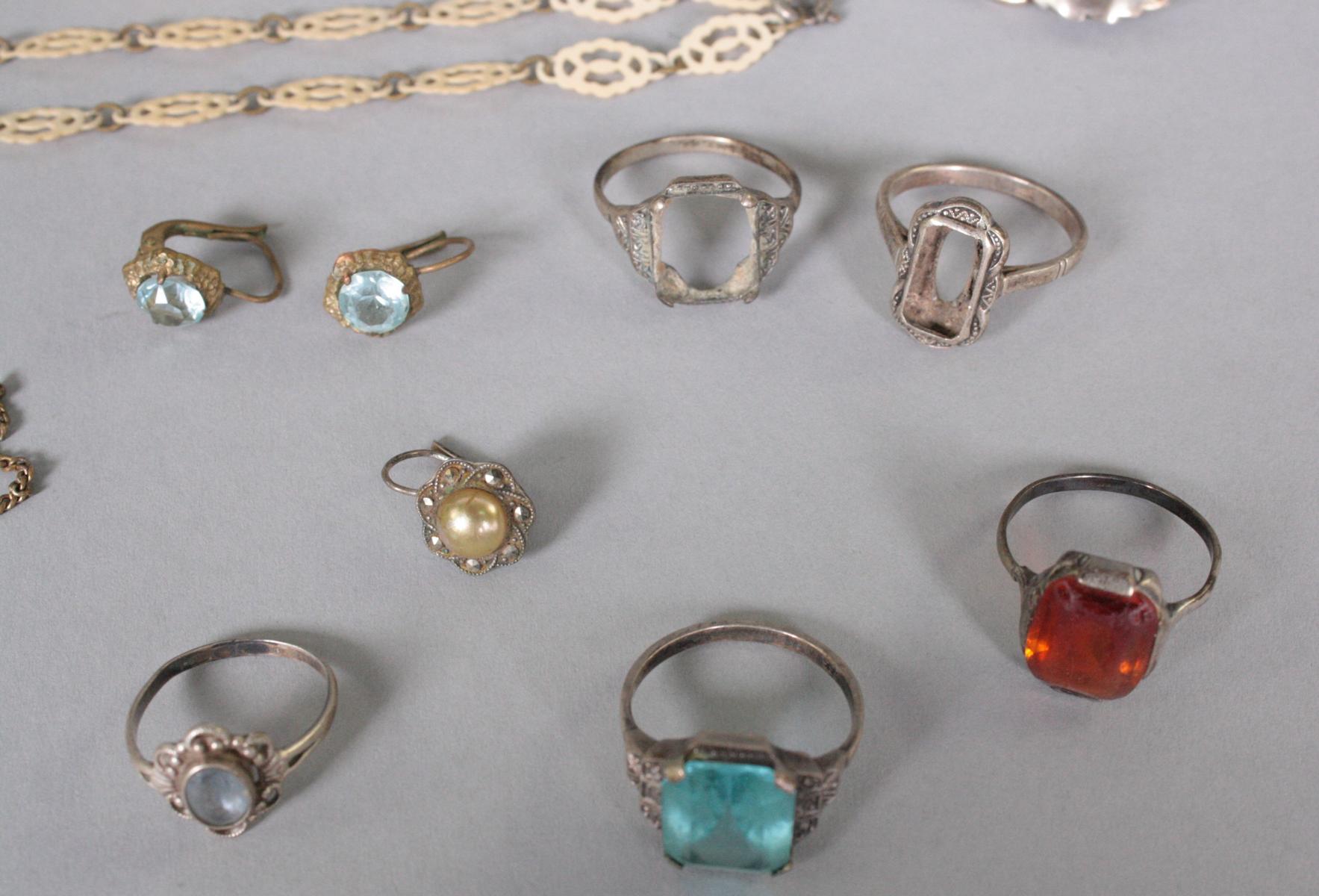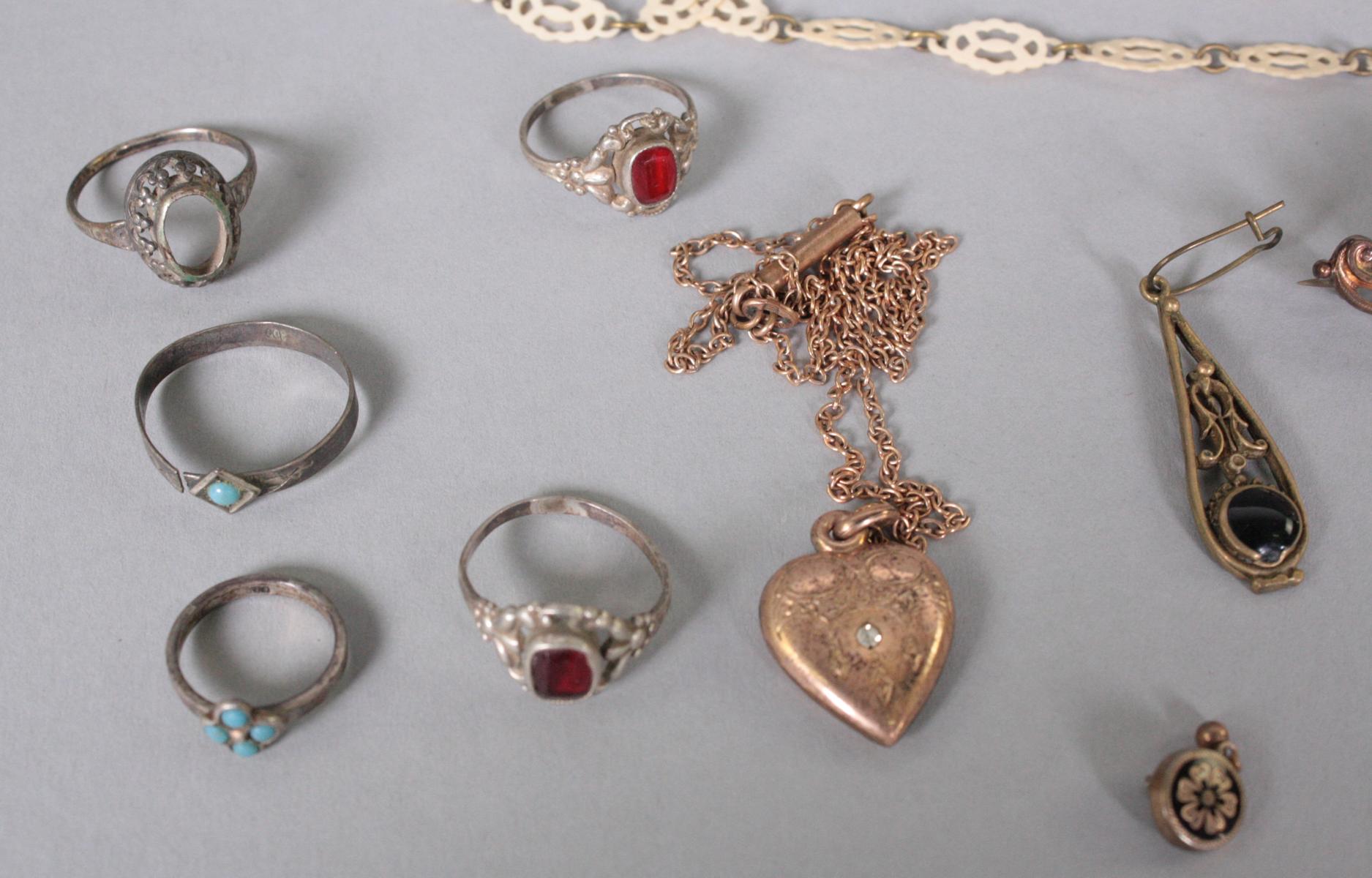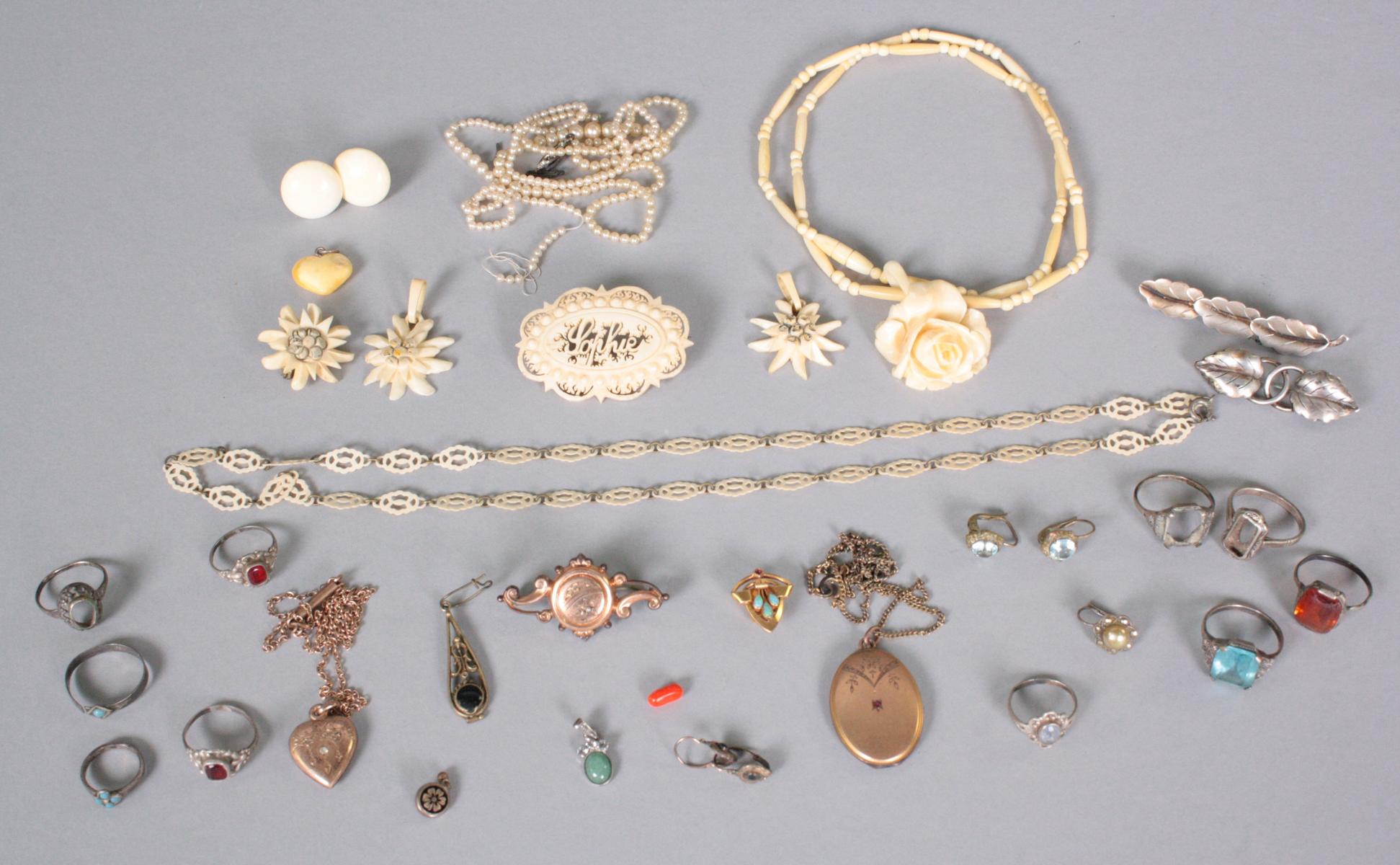 Posten Silberschmuck bestehend aus Ringen, Ohrringe und Broschen, ca. 30 g.Elfenbeinschmuck (Erbach), Medaillons, Bernsteinanhänger,Perlenkette mit gerissenem Strang, Biedermeierbrosche..