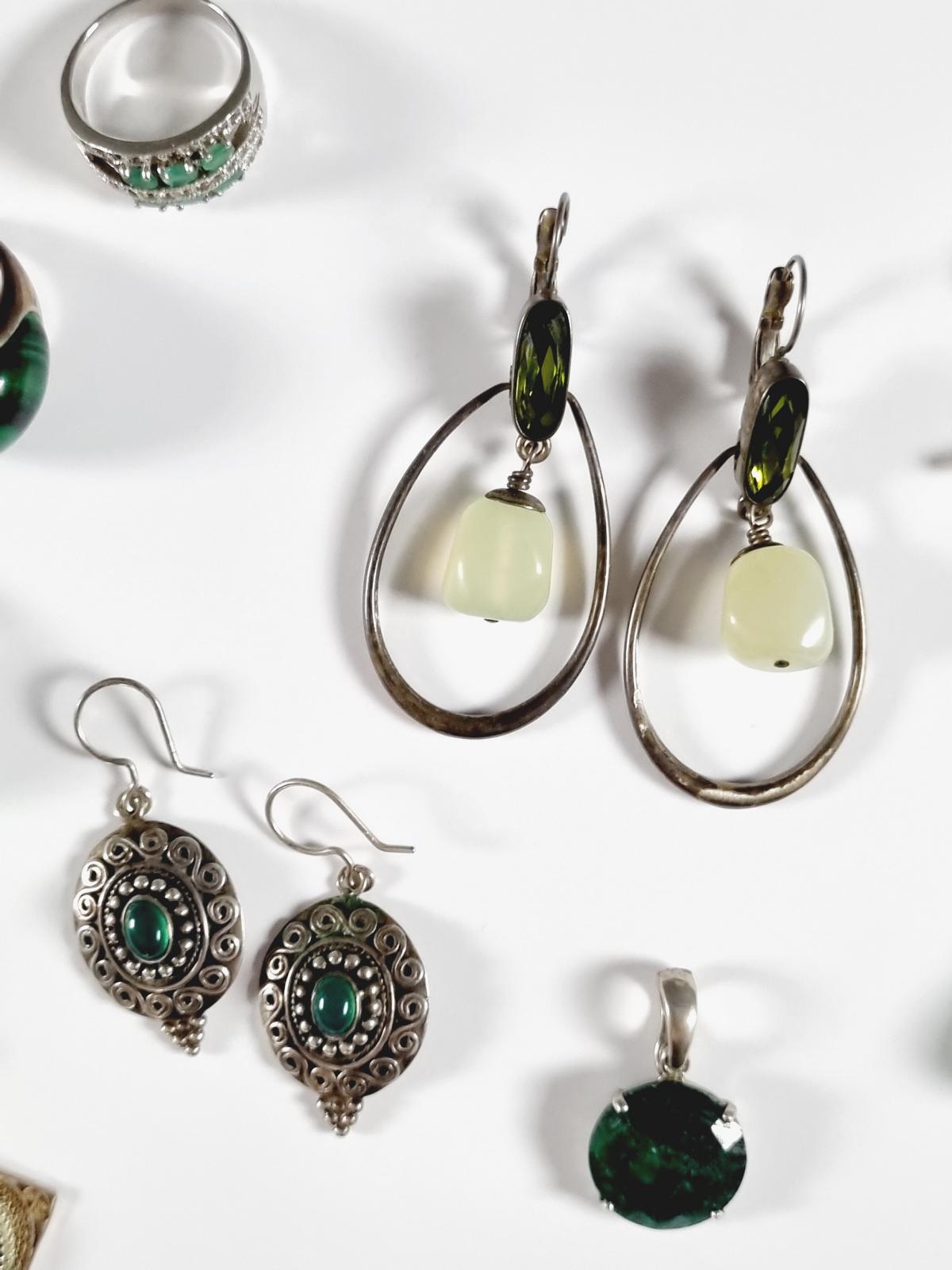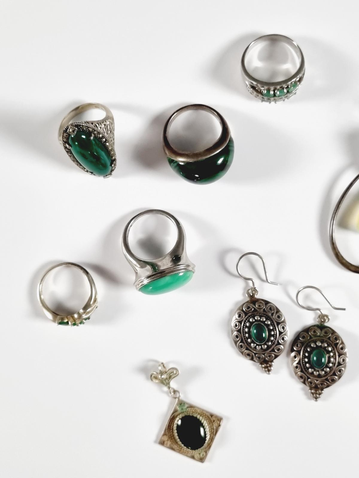 5 Ringe, Ringgrößen 57 bis 60, 4 Paar Ohrgehänge, davon einmal vergoldet ( 1 Verschluß fehlt), 2 Anhänger, zusammen ca. 96 g.