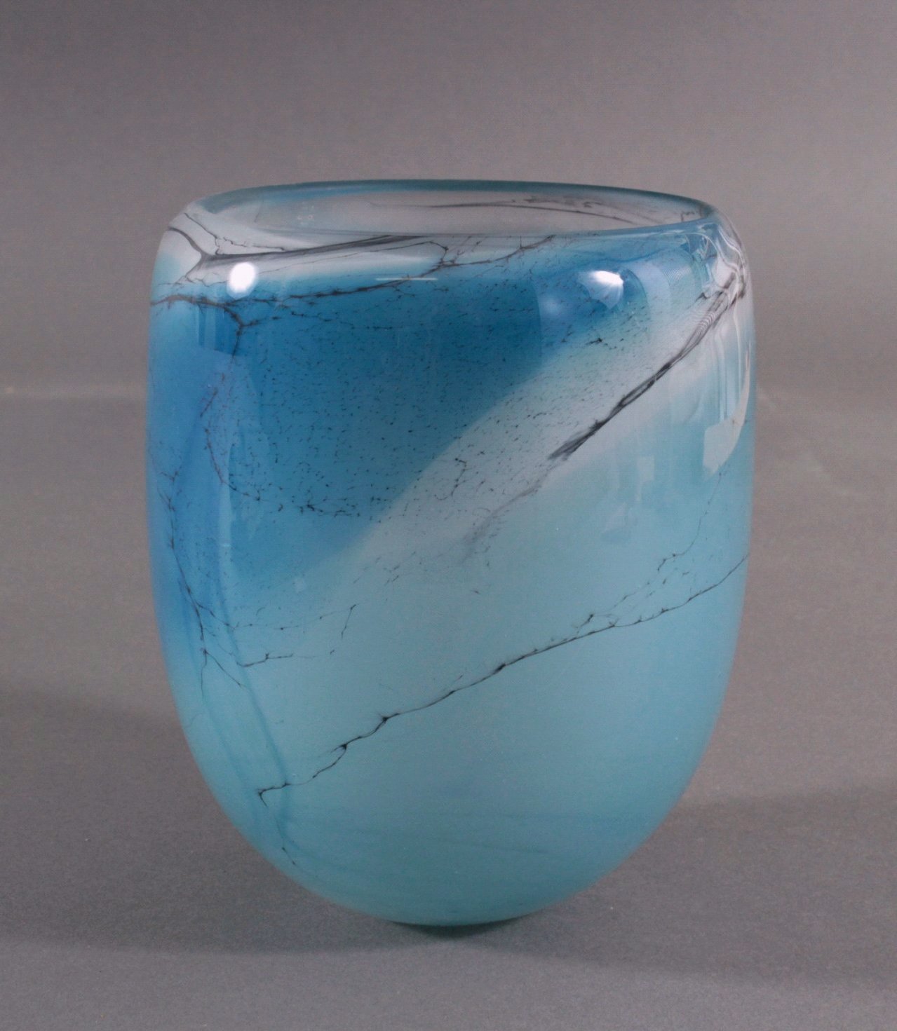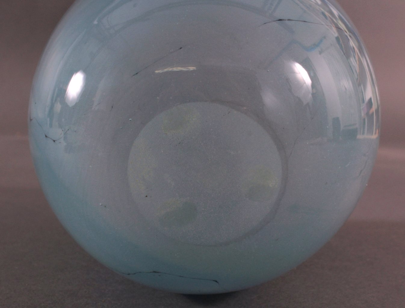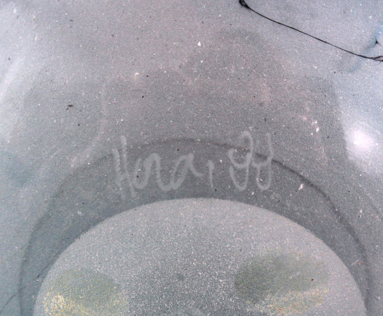 Opakes, dickwandiges Glas mit blauer Einschmelzung, Motiv ist von innen geschliffen und geätzt, auf der Unterseite signiert und datiert Hora 98, ca. H- 17,5 cm, D- 15 cm
