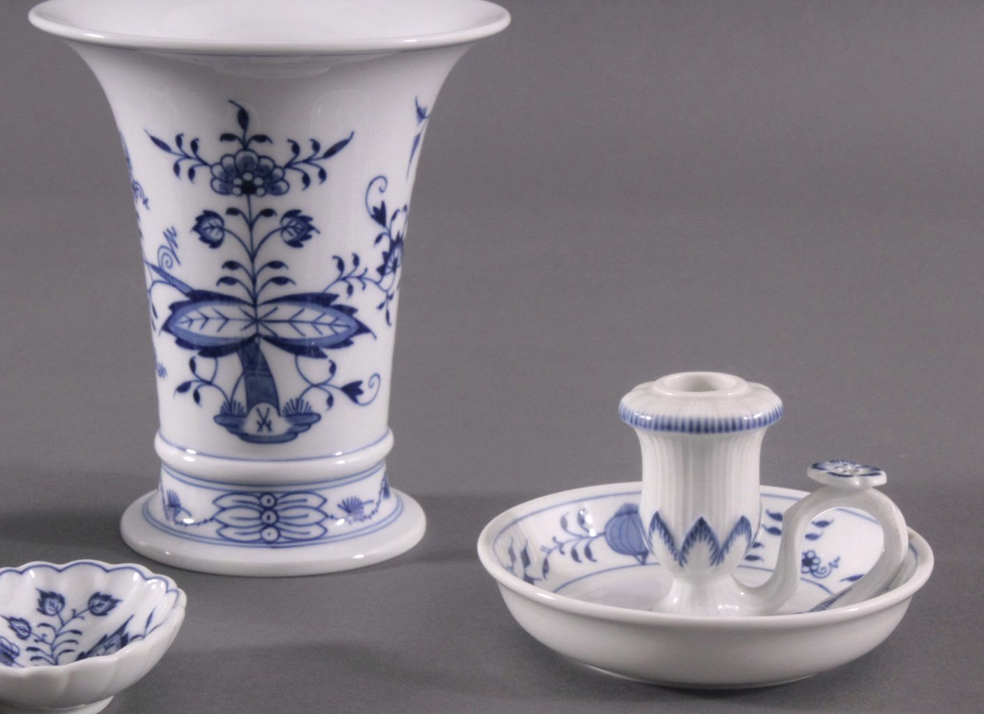 4 Teile, Porzellan. Trompetenförmige Vase, ca. H-16 cm, Cabaretschale, ca. H-5 cm, Kerzenhalter, ca. H-7 cm, Muschelschälchen, ca. H-6 cm, unterglasurblaue Schwertermarke