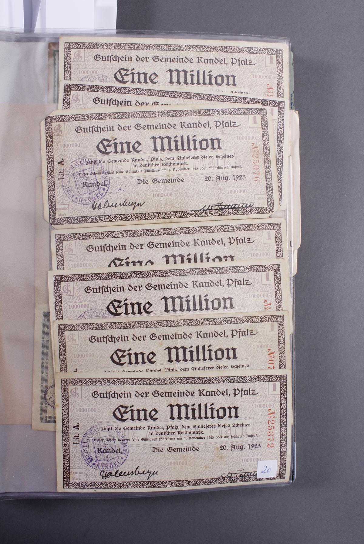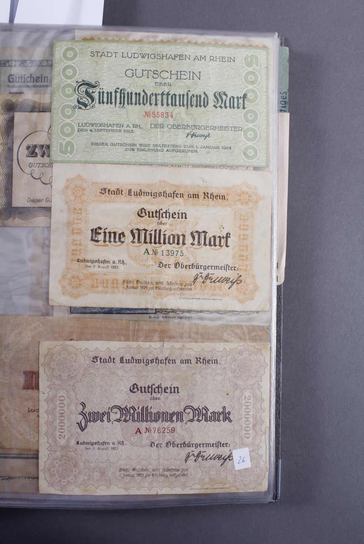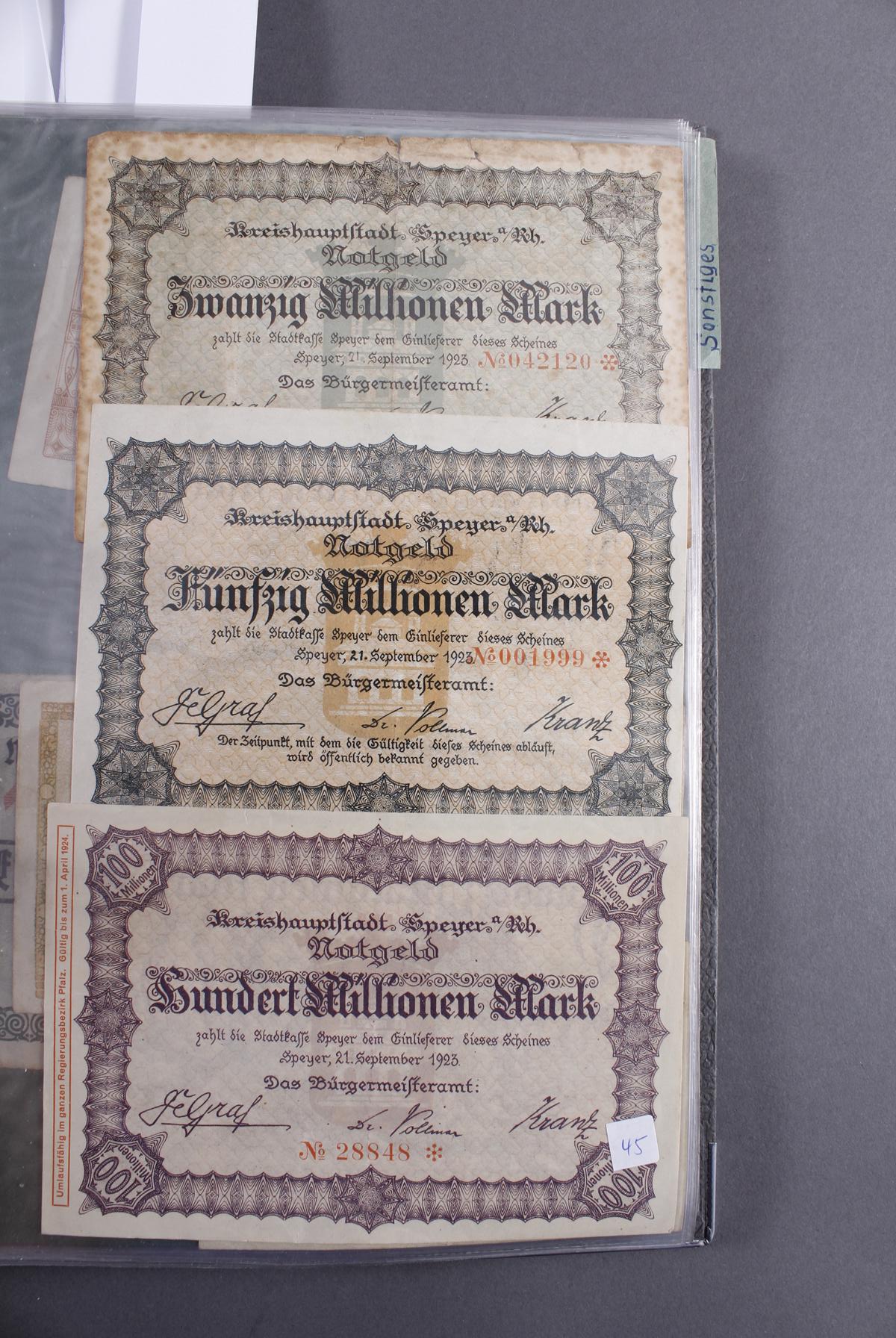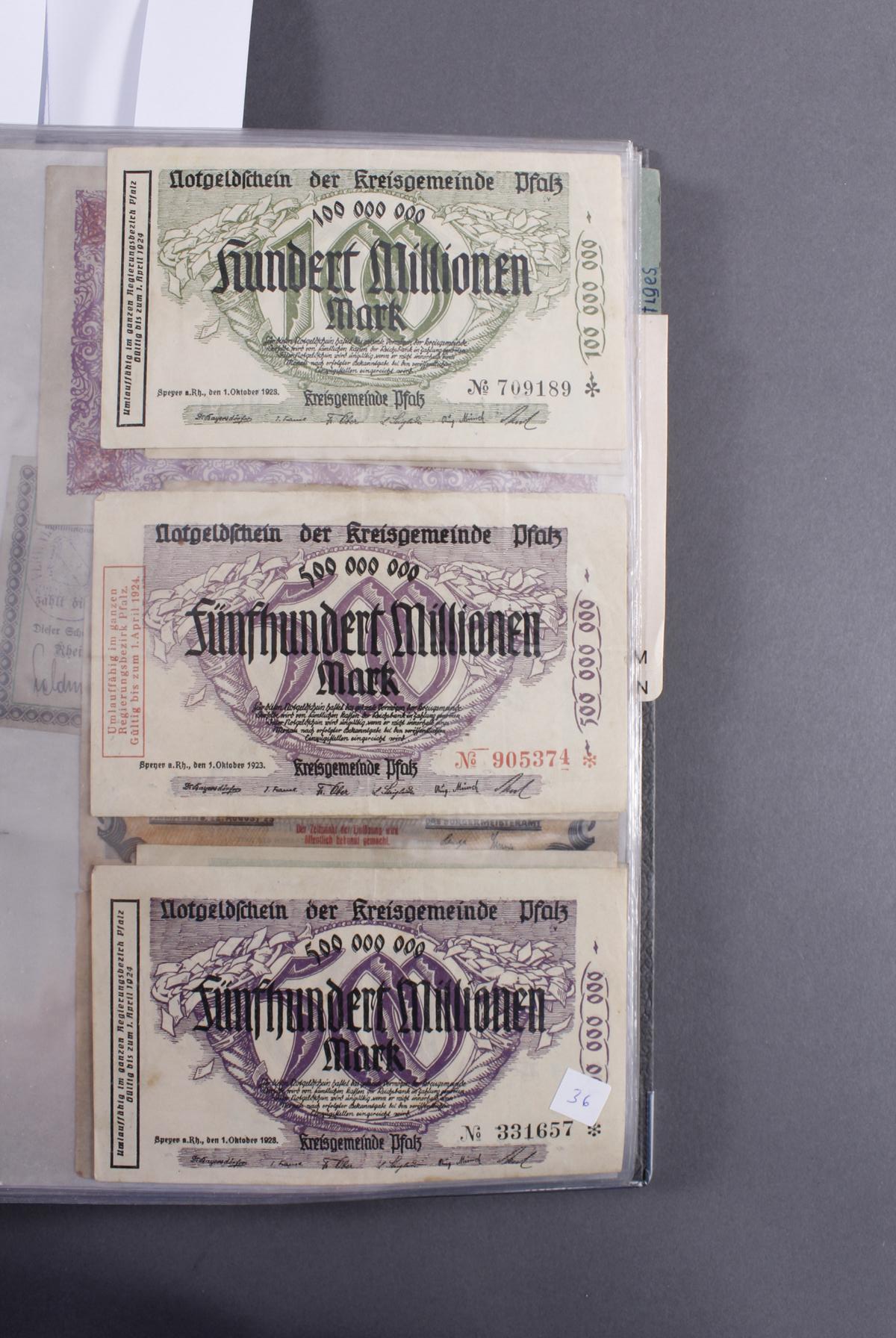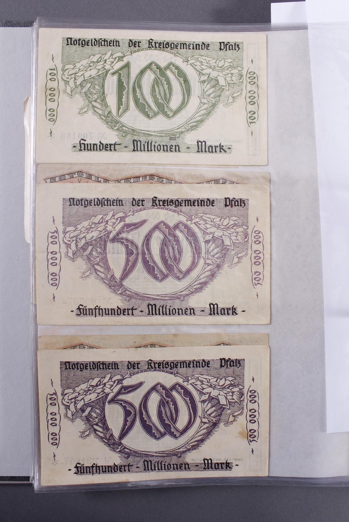 Insgesamt über 180 Banknoten. Notgeld aus den Städten: Annweiler, Alzey, Bellheim, Bergzabern, Dürkheim, Edenkoben, Frankenthal, Fockgrim, Germersheim, Grünstadt, Kaiserslautern, Kandel, Kirchheimbolanden, Landau (Pfalz), Ludwigshafen, Lauterecken, Neustadt an der Haardt, Oggersheim, Kreisgemeinde Pfalz, Pirmasens, Rheinzabern, Speyer, Zweibrücken, Zeiskam…Zudem Deutsche Länderbankoten aus Baden, Bayern, Württemberg und Sachsen.Scheine in unterschiedlichen Erhaltungen.
