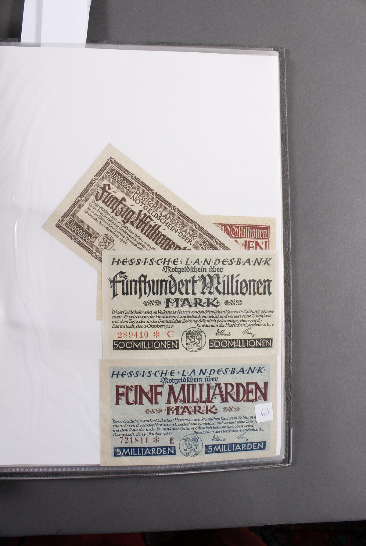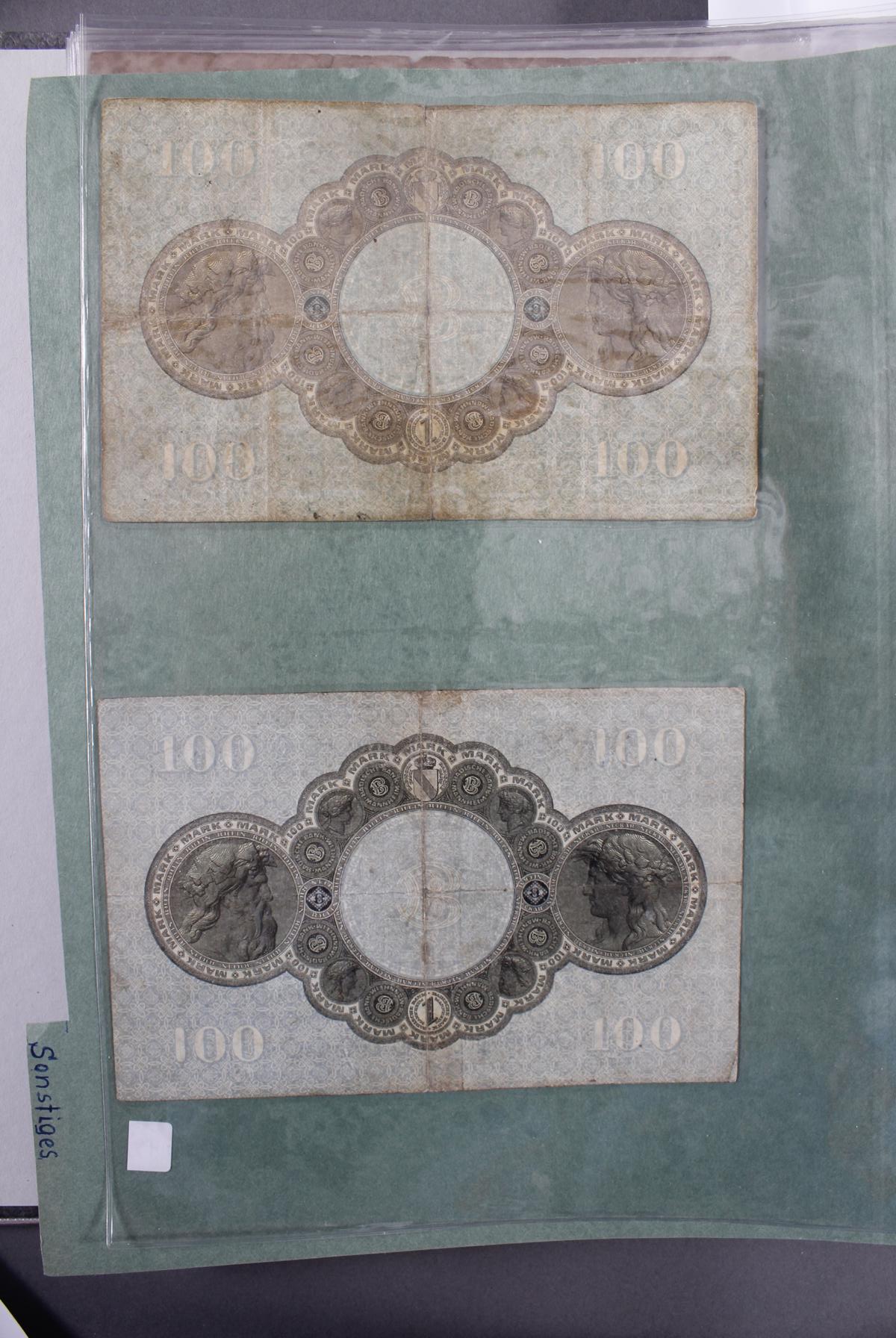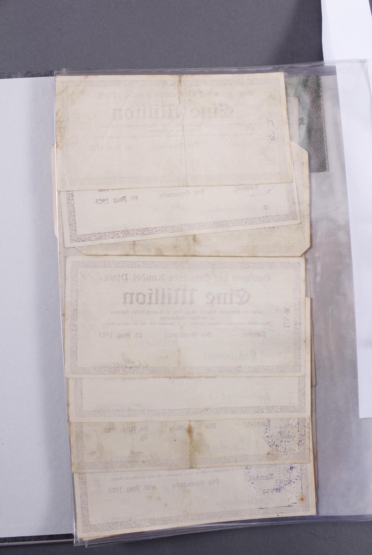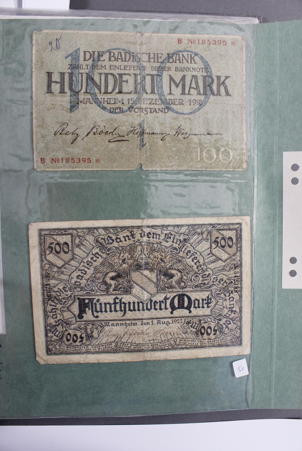 Insgesamt über 180 Banknoten. Notgeld aus den Städten: Annweiler, Alzey, Bellheim, Bergzabern, Dürkheim, Edenkoben, Frankenthal, Fockgrim, Germersheim, Grünstadt, Kaiserslautern, Kandel, Kirchheimbolanden, Landau (Pfalz), Ludwigshafen, Lauterecken, Neustadt an der Haardt, Oggersheim, Kreisgemeinde Pfalz, Pirmasens, Rheinzabern, Speyer, Zweibrücken, Zeiskam…Zudem Deutsche Länderbankoten aus Baden, Bayern, Württemberg und Sachsen.Scheine in unterschiedlichen Erhaltungen.