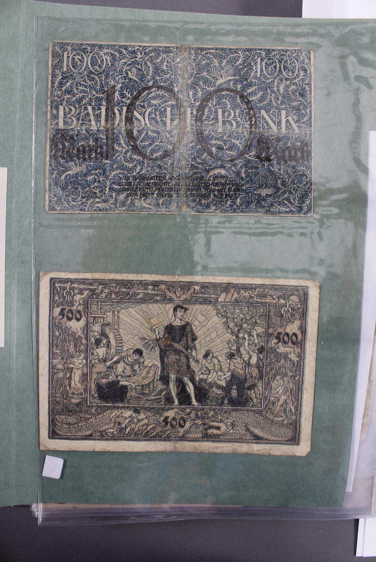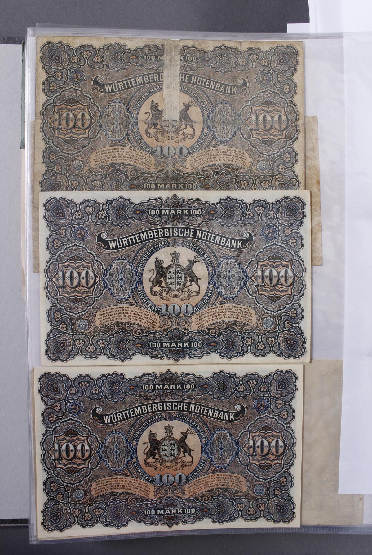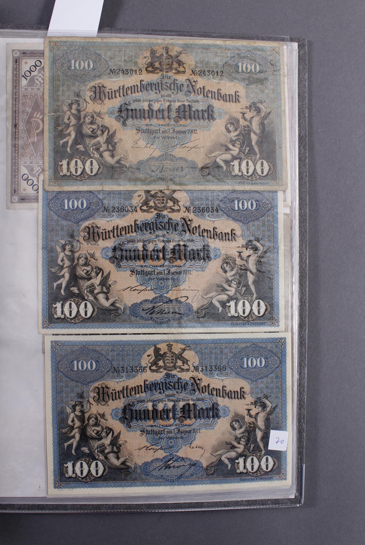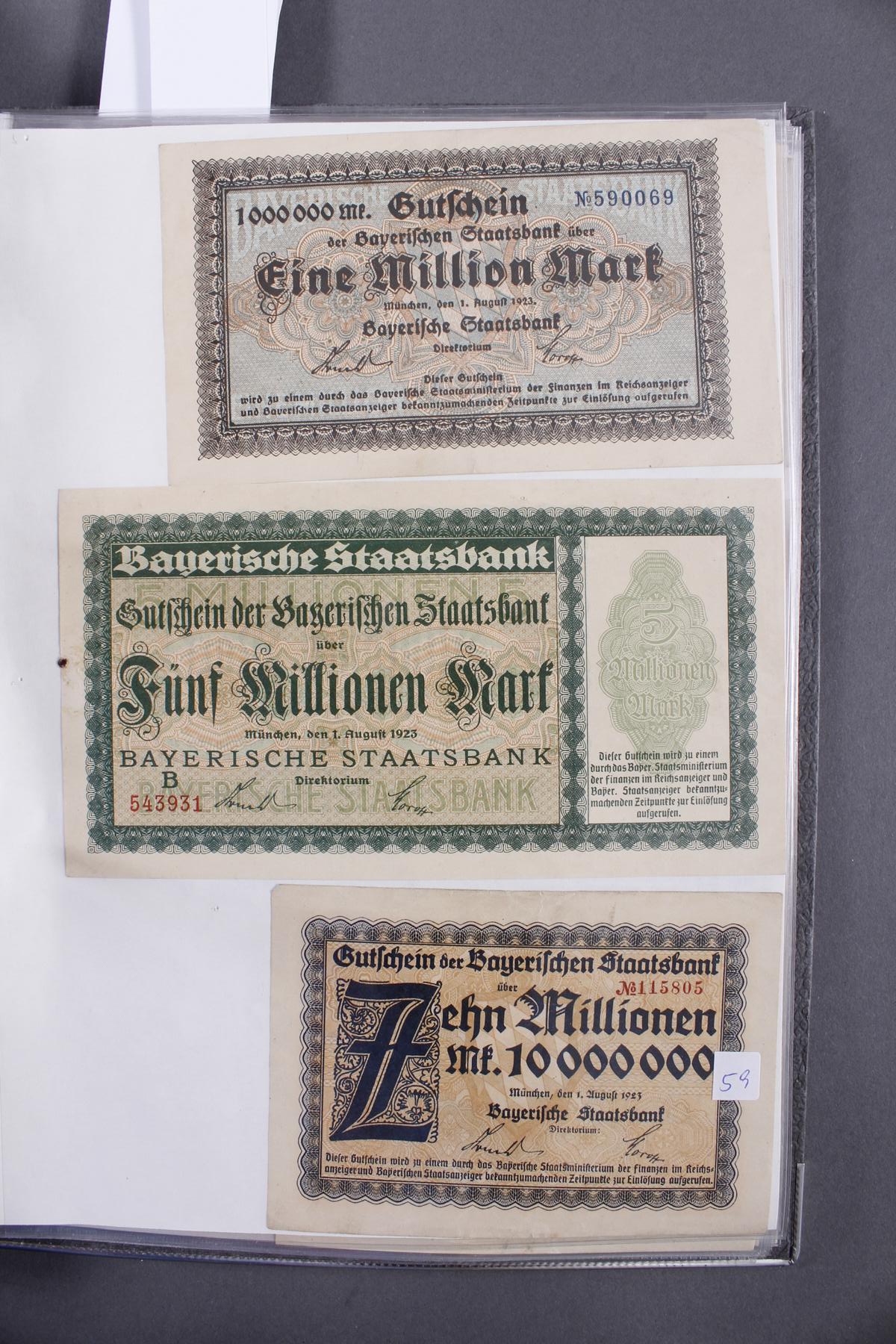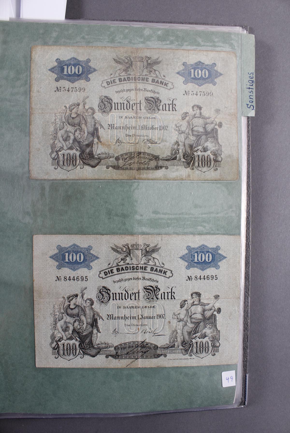 Insgesamt über 180 Banknoten. Notgeld aus den Städten: Annweiler, Alzey, Bellheim, Bergzabern, Dürkheim, Edenkoben, Frankenthal, Fockgrim, Germersheim, Grünstadt, Kaiserslautern, Kandel, Kirchheimbolanden, Landau (Pfalz), Ludwigshafen, Lauterecken, Neustadt an der Haardt, Oggersheim, Kreisgemeinde Pfalz, Pirmasens, Rheinzabern, Speyer, Zweibrücken, Zeiskam…Zudem Deutsche Länderbankoten aus Baden, Bayern, Württemberg und Sachsen.Scheine in unterschiedlichen Erhaltungen.