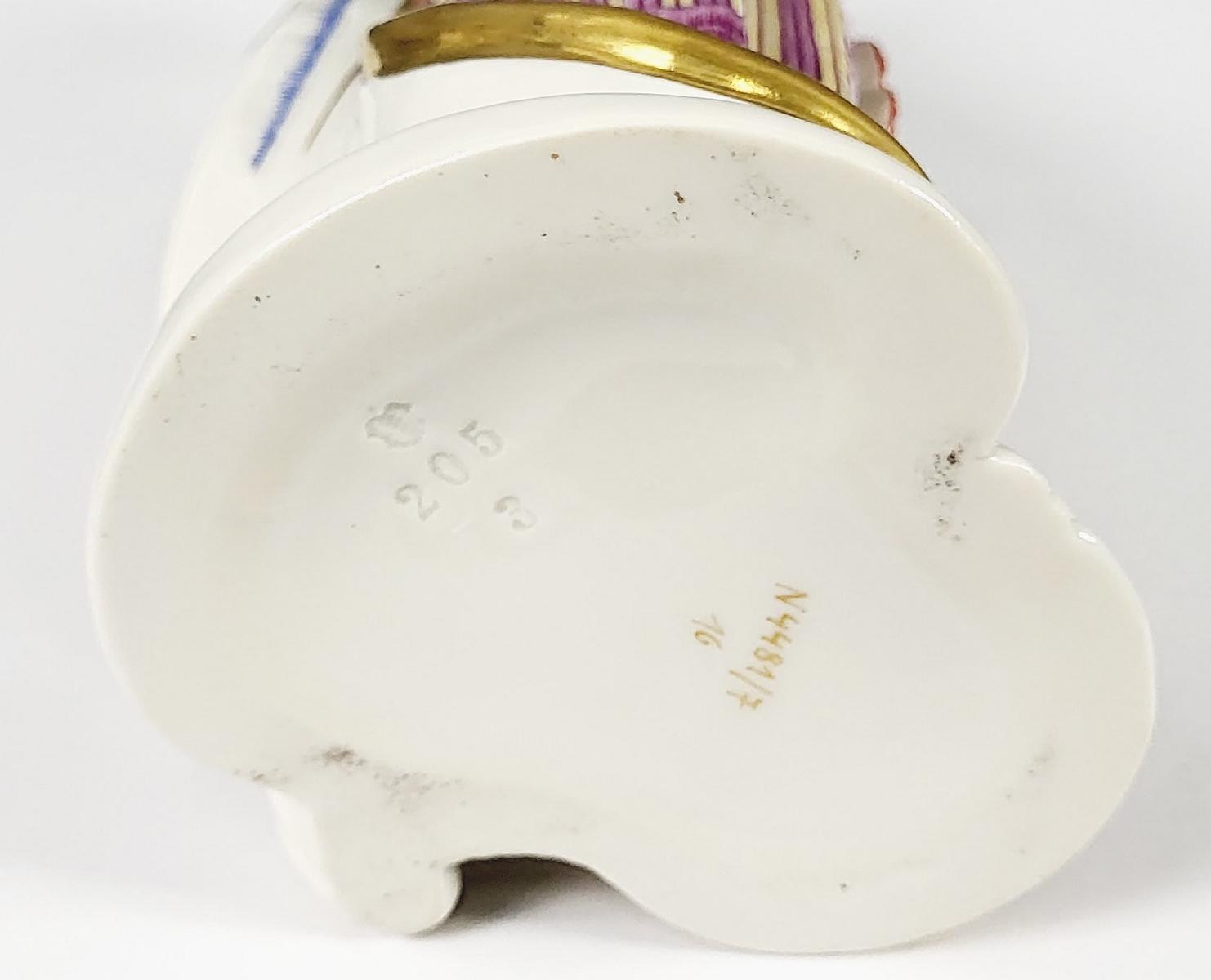 Porzellan, polychrom und goldbemalt. Gepresstes Rautenschild Nymphenburg, Modellnummer 205. Nach Entwurf von F. A. Bustelli, Höhe ca. 21 cm