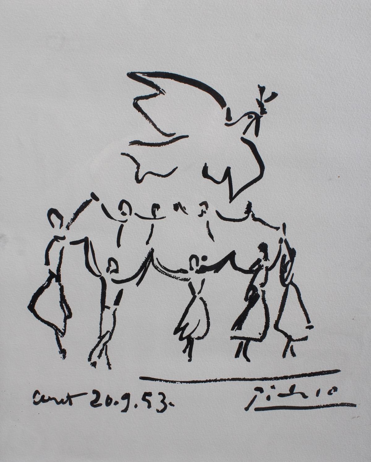 Lithographie auf Bütte ‚La Sardanna de la Paix ‚ Darstellung einer tanzenden Menschengruppe mit Friedenstaube.Im Stein signiert und datiert- Ceret; 20.9.53. Hinter Glas gerahmt . Höhe ca. 54 cm, Breite ca. 38 cm.