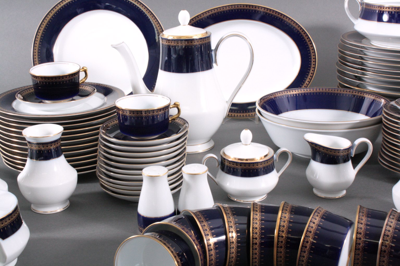 98-teilig. Dekor: Kobaltblau mit Goldstaffagen. 1 Kaffeekanne mit Deckel, ca. H- 23,5 cm. 2 kleine bauchige Vasen, ca. H- 11,5 cm. 2 kleine Vasen, ca. H- 11 cm. 1 Salzstreuer, ca. H- 8,5 cm. 1 Pfefferstreuer, ca. H- 8,5 cm. 1 Milchkännchen, ca. H- 8,5 cm. 1 Zuckerbehälter mit Deckel, ca. H- 10 cm. 14 Kaffeetassen, ca. H- 5 cm. 14 Untertassen, ca. D-1 2,7 cm. 14 Kuchenteller, ca. D-16cm. 13 Unterteller, ca. H-21,5cm. 13 Suppenteller, ca. D-19cm. 14 große Teller , ca. D-27cm. 1 Suppenschüssel ohne Deckel , ca. H-9cm. 2 Salatschüsseln, ca. D-22,cm. 2 Servierplatten, ca. L-29,5cm. 1 Sauciere, ca. L-21cm. 1 Stövchen, ca. H-7,5cm.