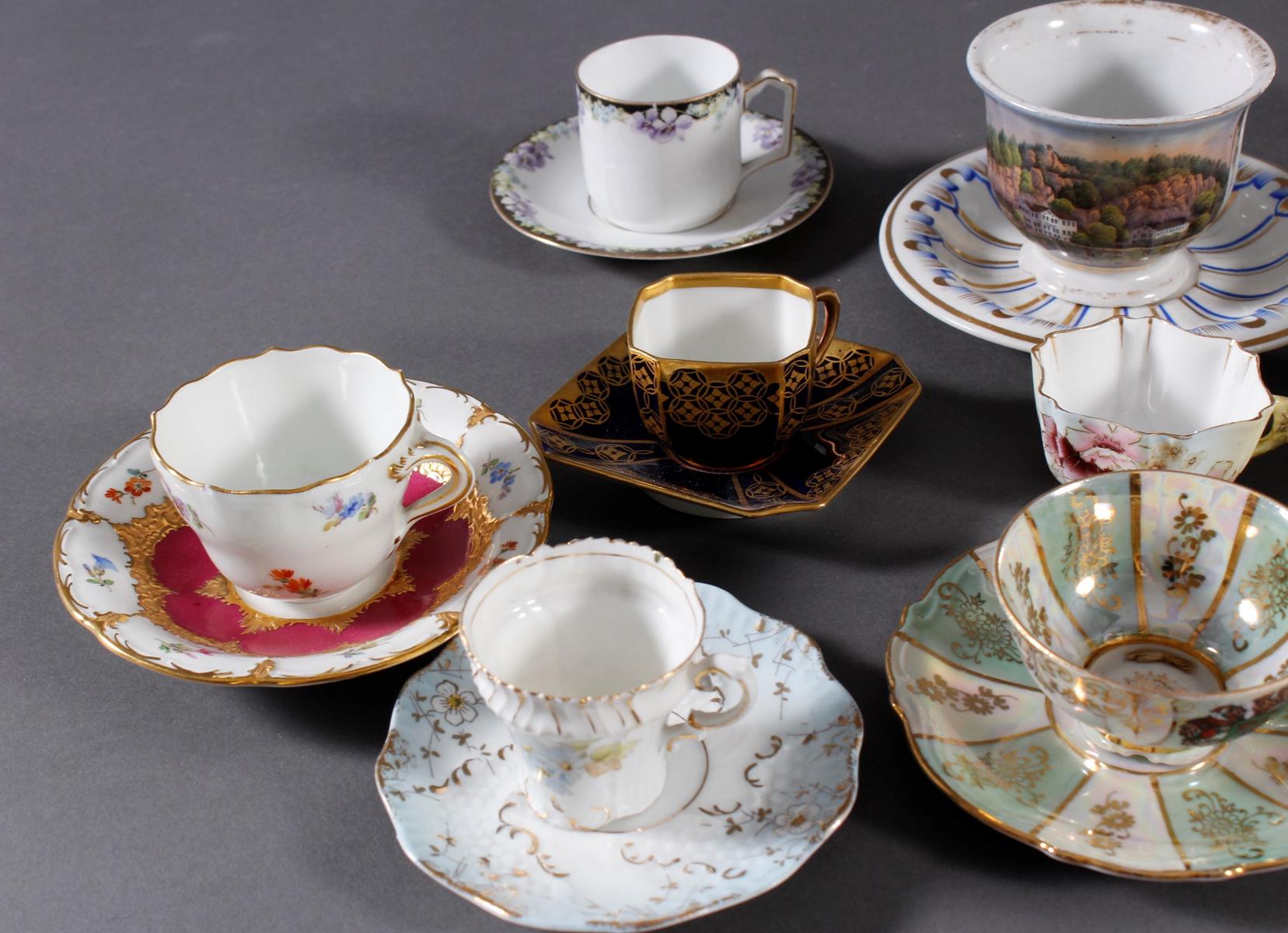 16 Stück. Porzellan, verschiedene Manufakturen, u. a. Meissen an Mündung kleine bestoßung, Rosenthal, Hutschenreuther. Alle reich verziert, 7x ohne Untertassen, Ansichtentasse am Standring bestoßen