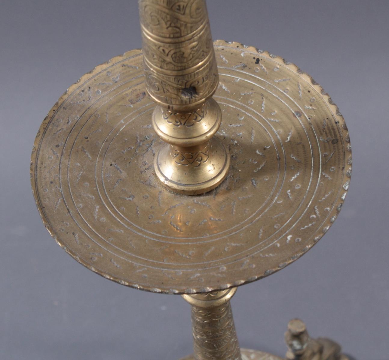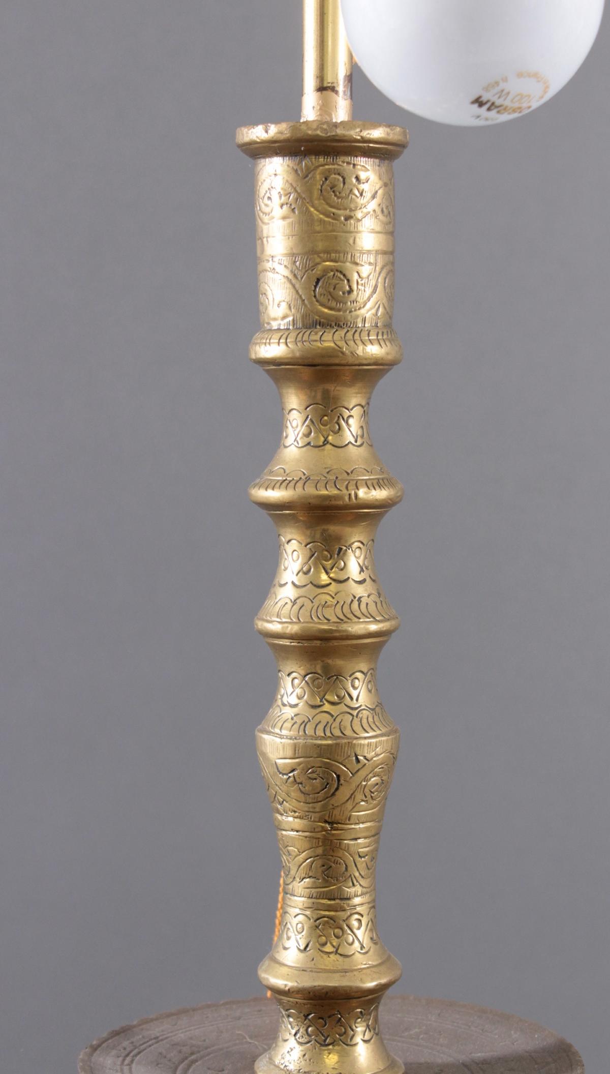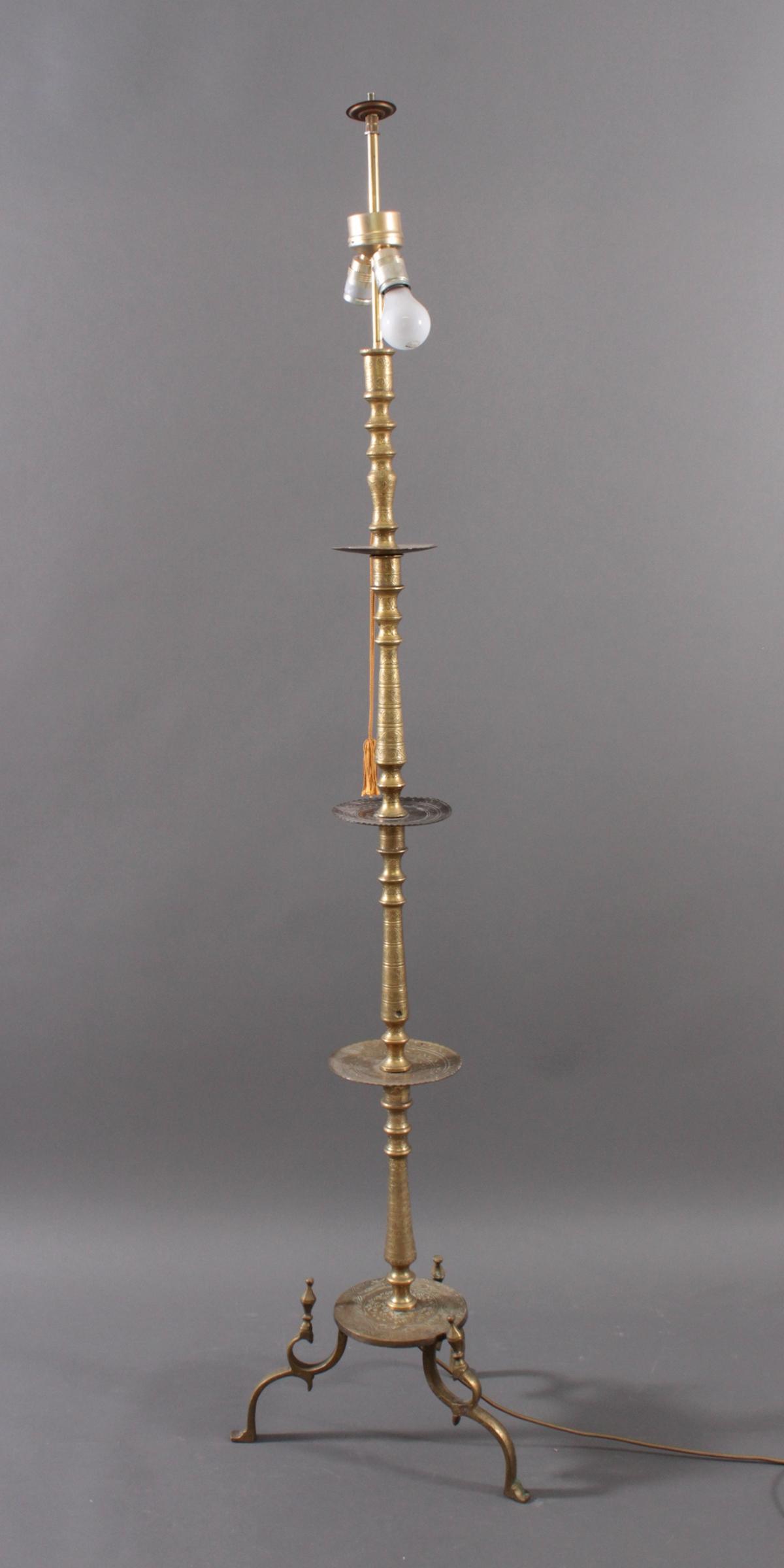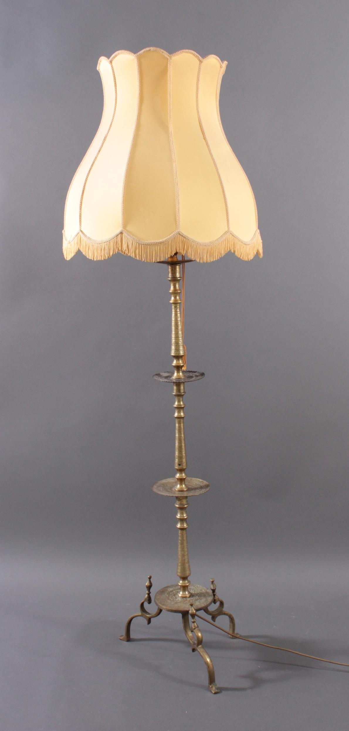 Messing, 2-flammig. Gegliederter Balusterschaft, reich verziert, auf 3 Füßen, Stoffschirm (Fleckig), ca. Höhe 178 cm. Elektrifizierend, Alters- und Gebrauchsspuren