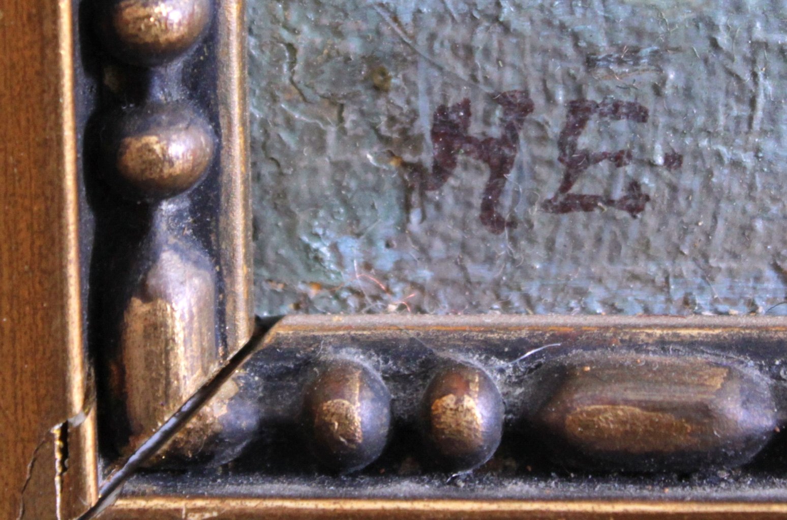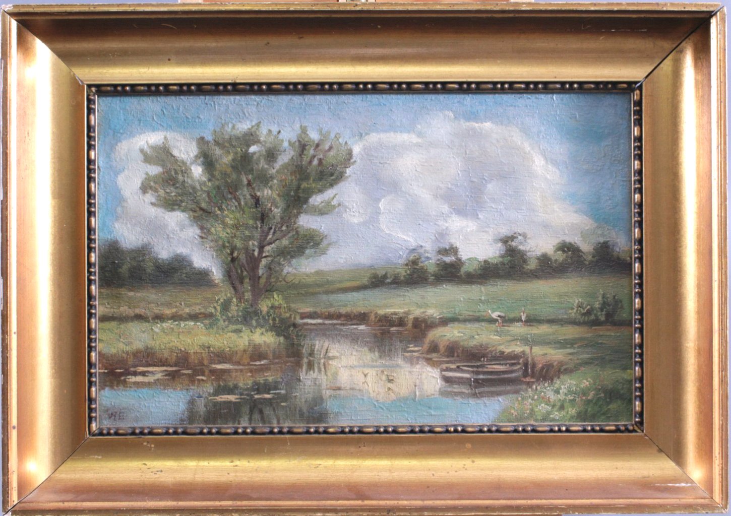 Sommerliche Flußlandschaft mit Boot und Störchen, Öl auf Leinwand gemalt, unten links mit Monogramm HE., zeitgemäßer Rahmen (mit Abplatzungen), auf der Rückseite mit Bleistift benannt, ca. 23 cm x 37 cm, Rahmen 33 cm x 47 cm