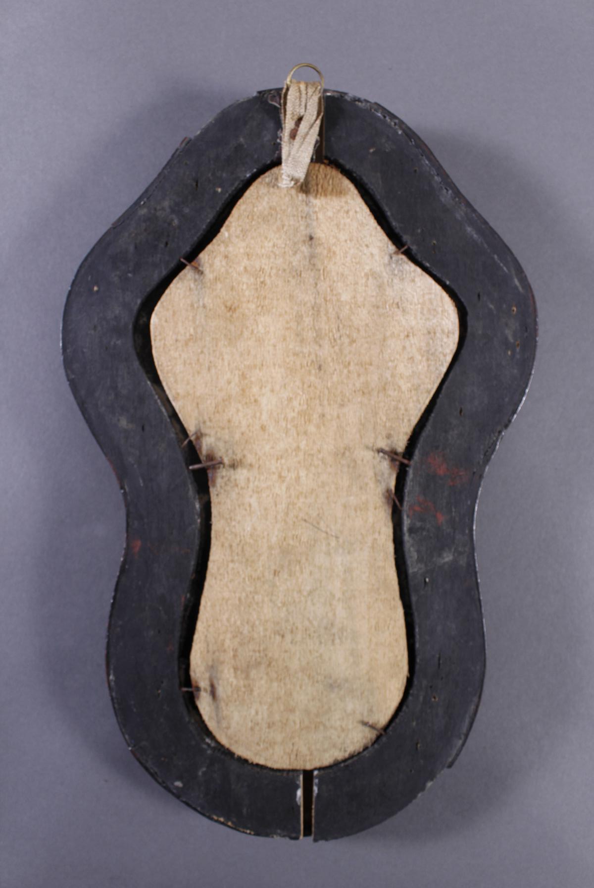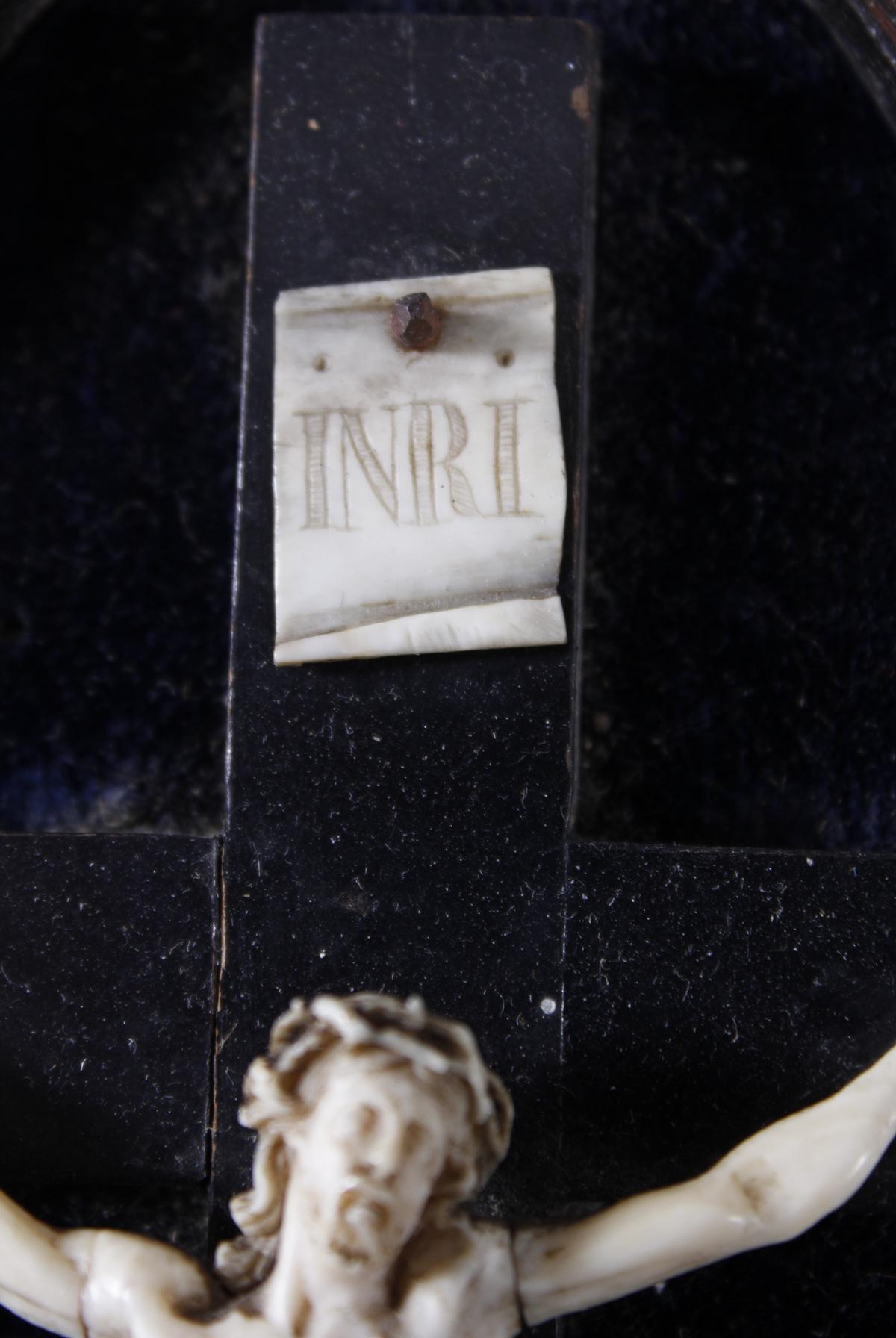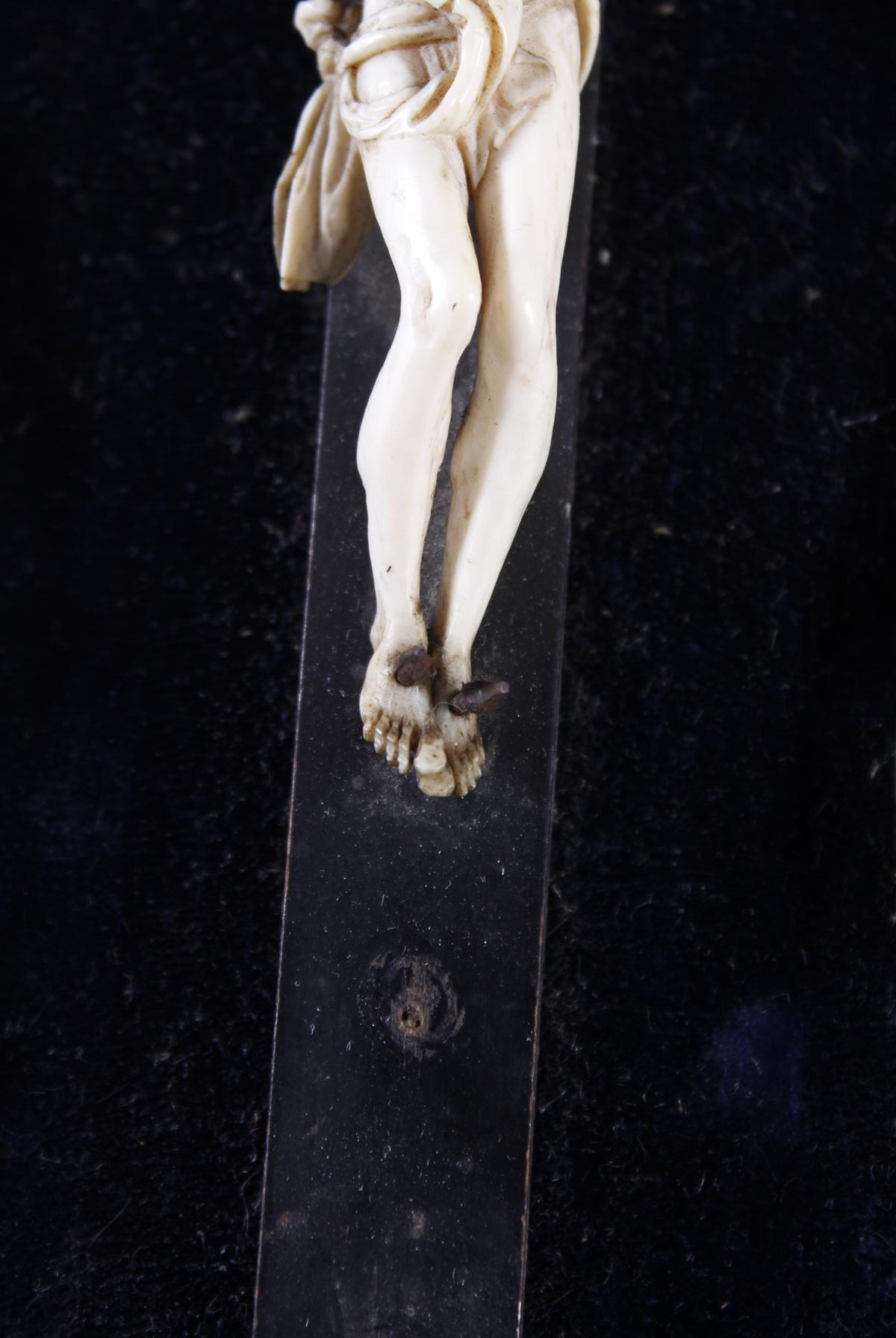 Elfenbein Corpus Christi mit INRI Schild auf ebonisierten Holzkreuz. Kreuz auf Samt, in geschweift profilierten Rahmen.Feine Schnitzarbeit mit schöner Alterspatina als Vier-Nagel-Typus.Gesamtmaß ca. 33 x 20,5 cm. Christus ca. 10 x 7,5 cm.Zeigefinger der linken Hand bestoßen.