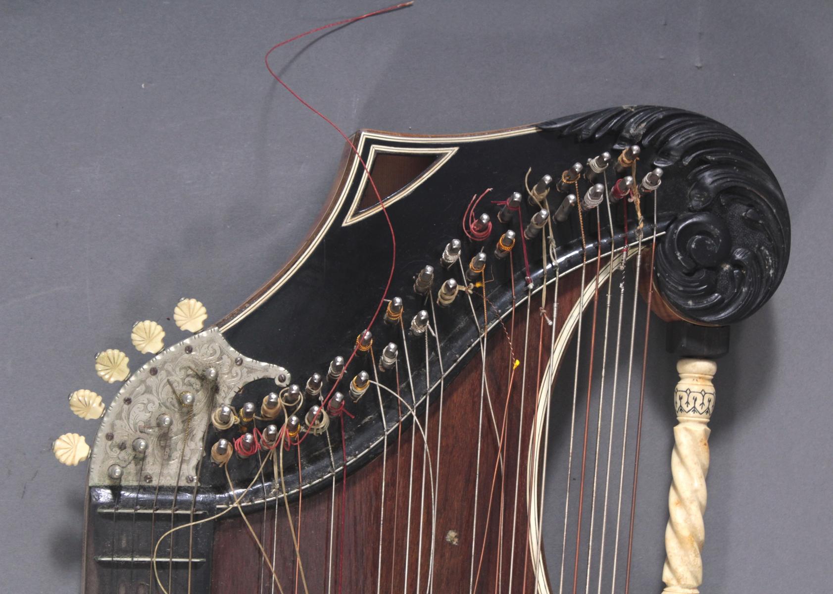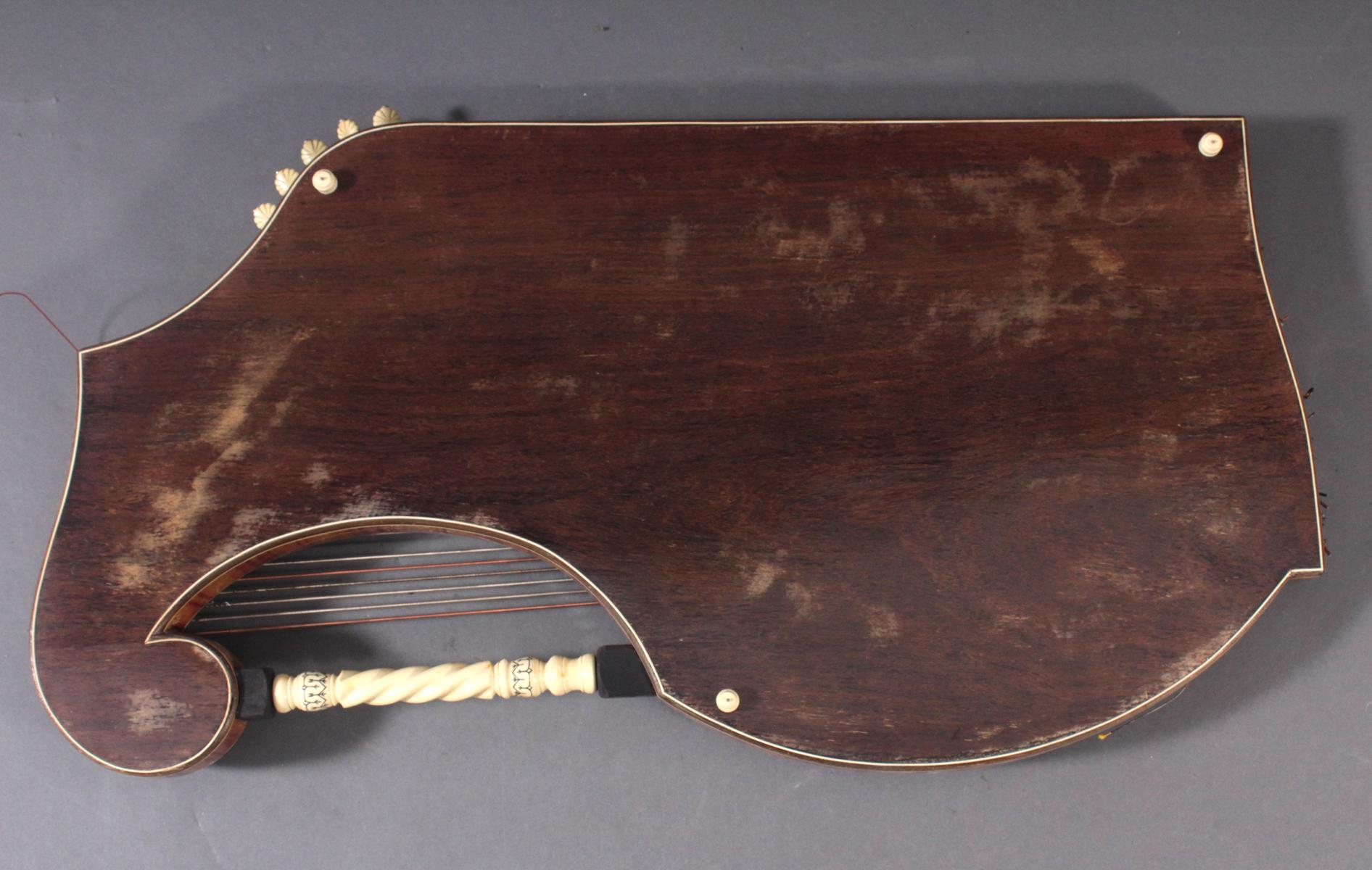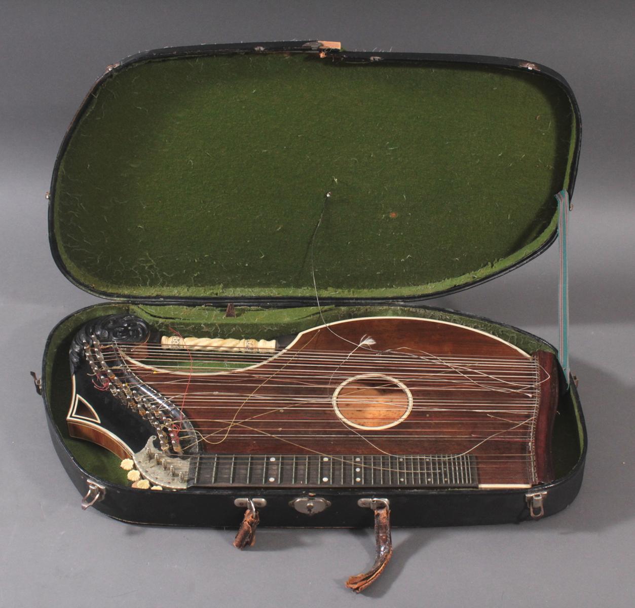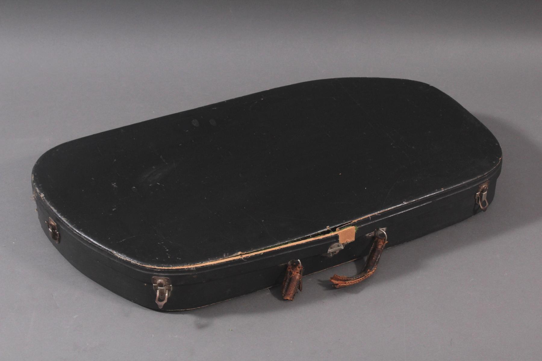 Holz dunkel gebeizt, Bandintarsien, Stellschrauben und Säule aus Bein, verzierte Metallbeschläge, Lederbezogener Koffer (Mottenbefall und starke Gebrauchsspuren), innen mit Verkäuferbezeichnung ‚Otto Thoss, Musikinstrumente Waldshut-Baden‘, einige Seiten lose, ca. Länge 67 cm.